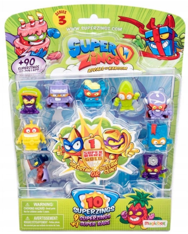 To gratka dla fanów SuperZings! W tym blistrze znajduje się aż 10 różnych figurek SuperZings, a wśród nich ukrywa się jedna super rzadka postać w kolorze złotym.