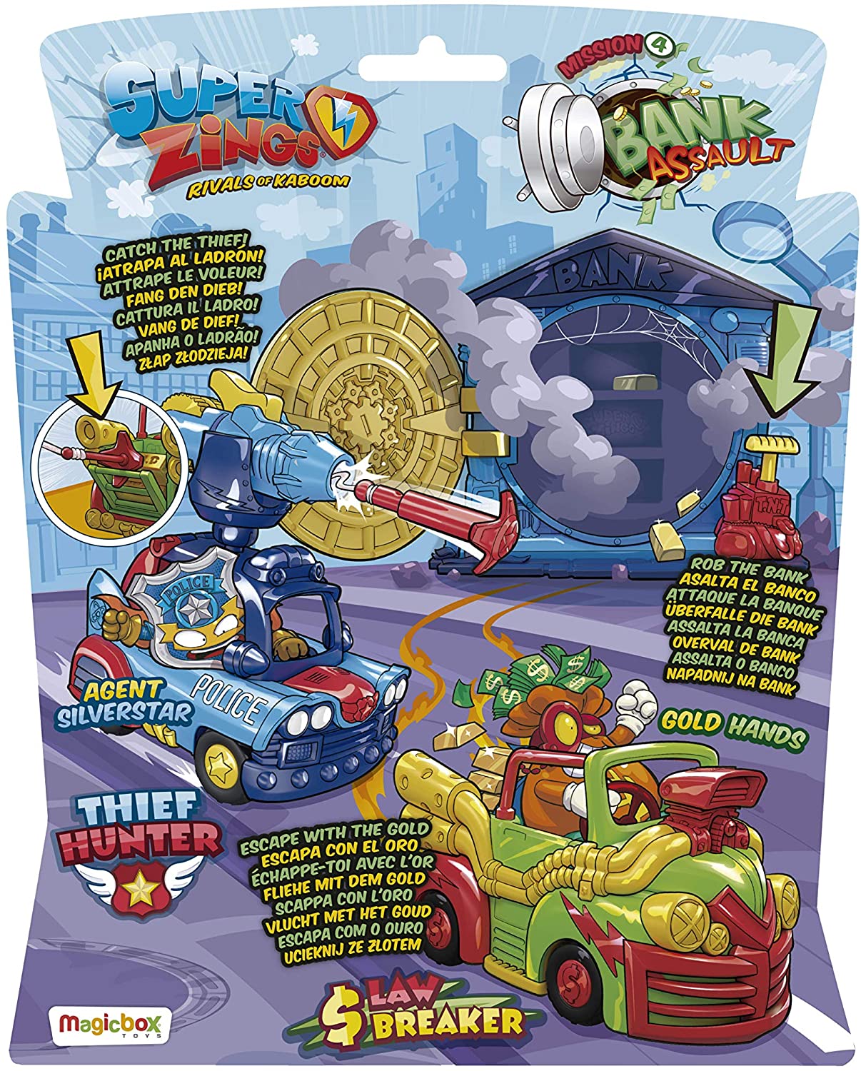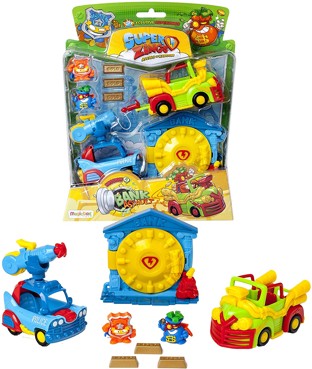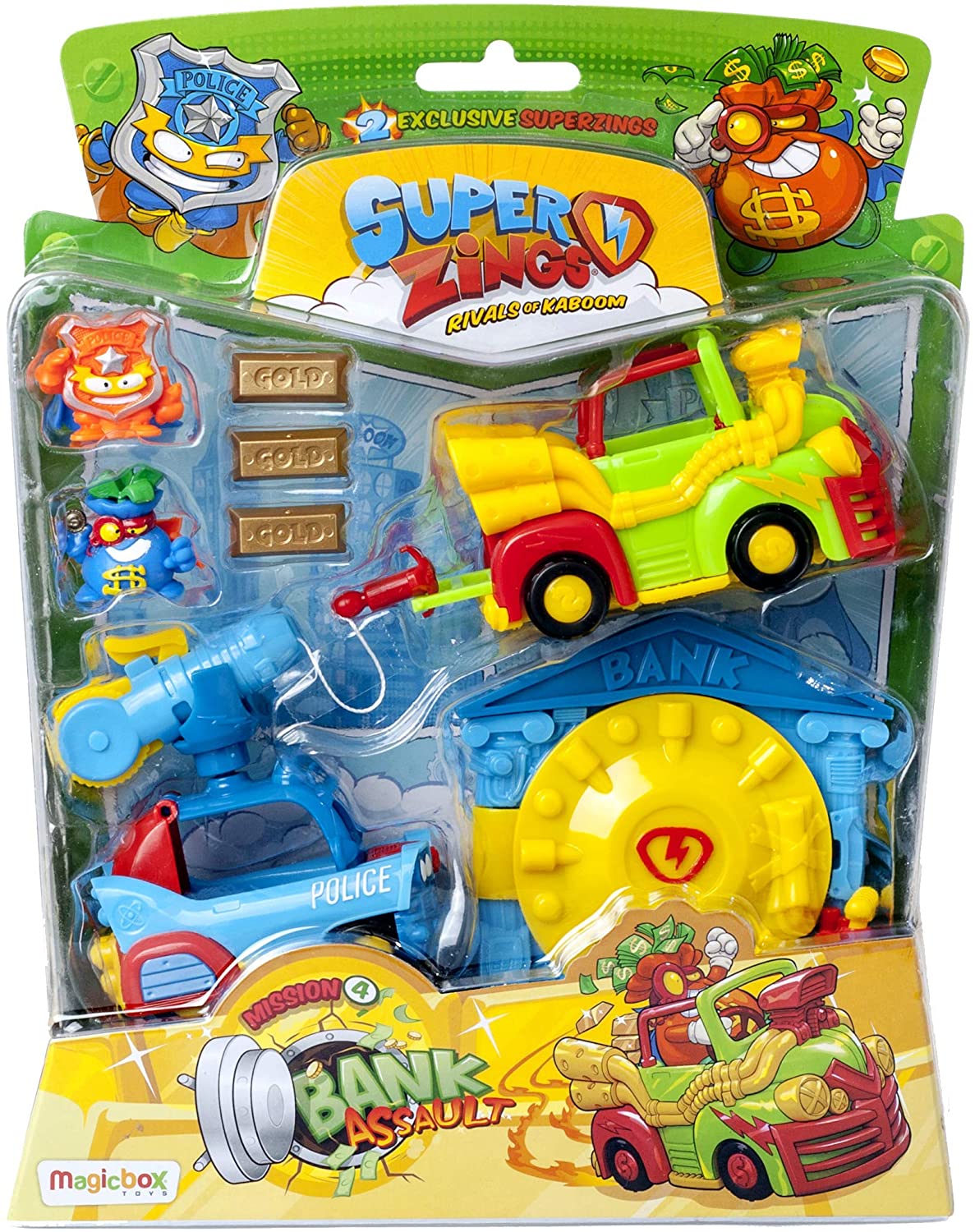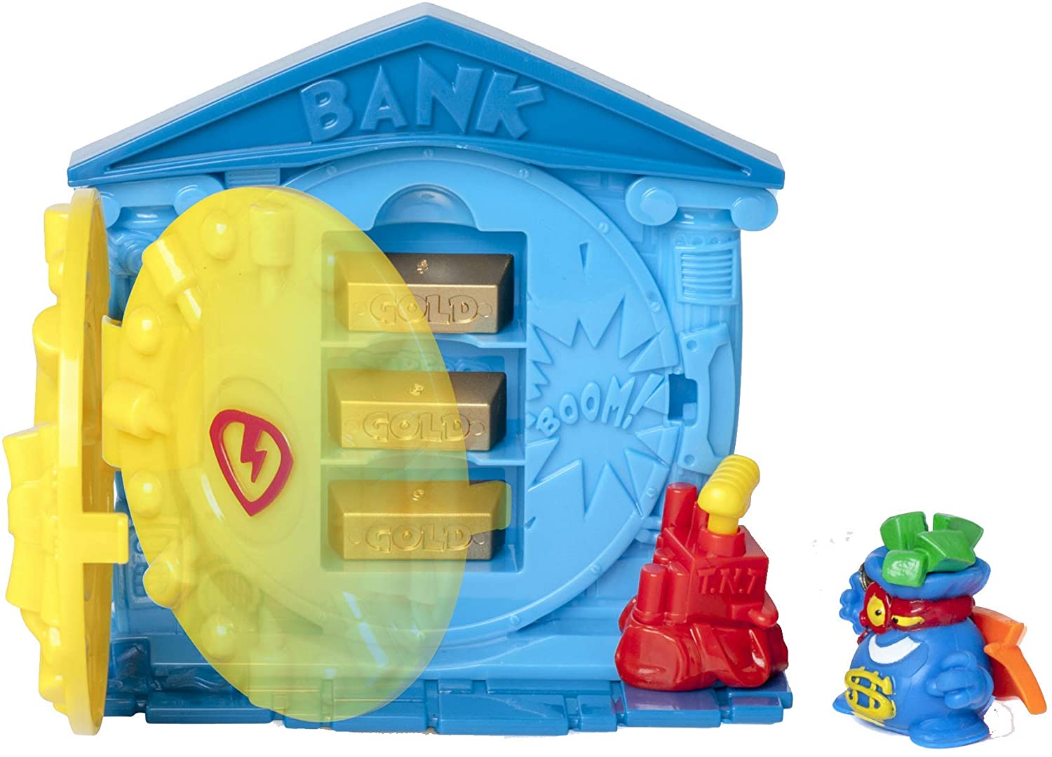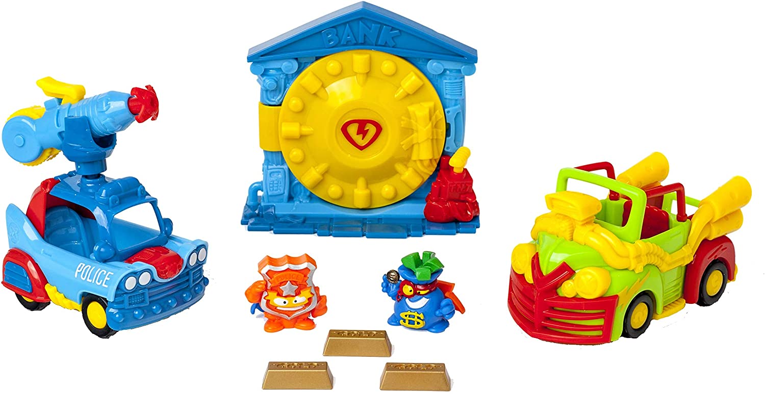 W zestawie znajduje się budynek banku z dwoma pojazdami i dwiema figurkami oraz akcesoria tematyczne.