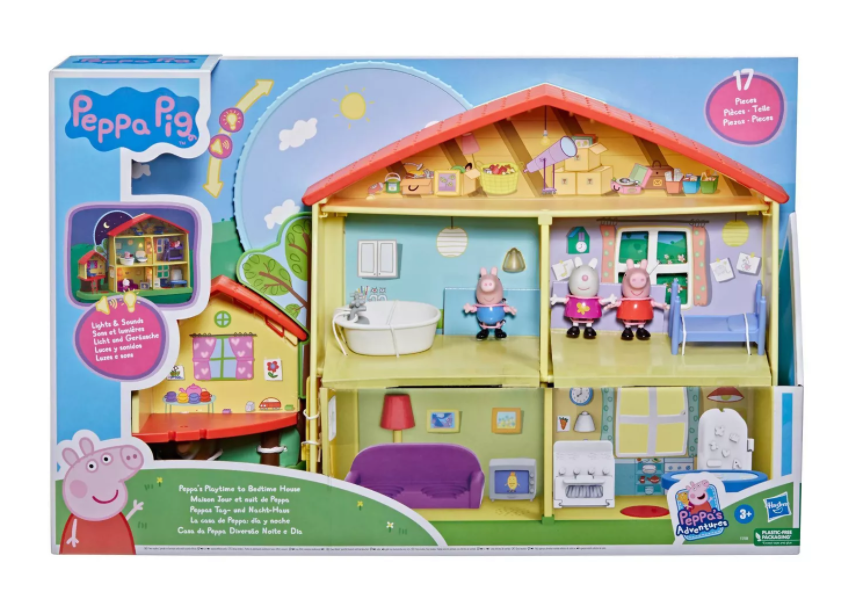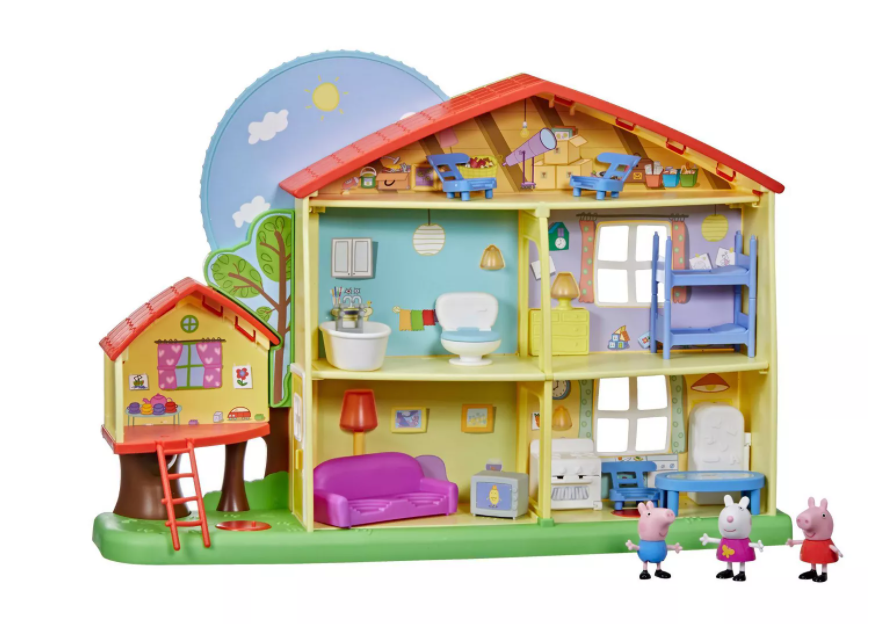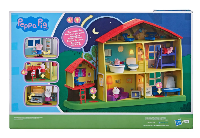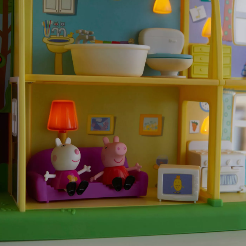 Peppa uwielbia spędzać czas w najbliższymi- rodziną i kolegami. Domek jest 3-piętrowy i 5-pokojowy, wyposażony został w tarczę, która pozwala dzieciom wybrać tryb dzienny lub nocny. W trybie dziennym narrator zabawy może powiedzieć: „Jest piękny słoneczny dzień”. W trybie nocnym może powiedzieć: „Zbliża się pora snu”. Dzieci usłyszą piosenkę przewodnią serialu i dźwięki tętniącego życiem domu, w tym tykanie zegarów, spłukiwanie toalet i ćwierkanie świerszczy. W trybie nocnym dom rozświetlają światła. Dwa hotsoty, wewnątrz i na zewnątrz, są aktywowane poprzez umieszczenie na nich figurki; reagują różnie w zależności od trybu, w którym znajduje się dom. Mając tyle do odkrycia, jest mnóstwo przygód do przeżycia. Dziś Peppę i Georga odwiedziła Suzy.