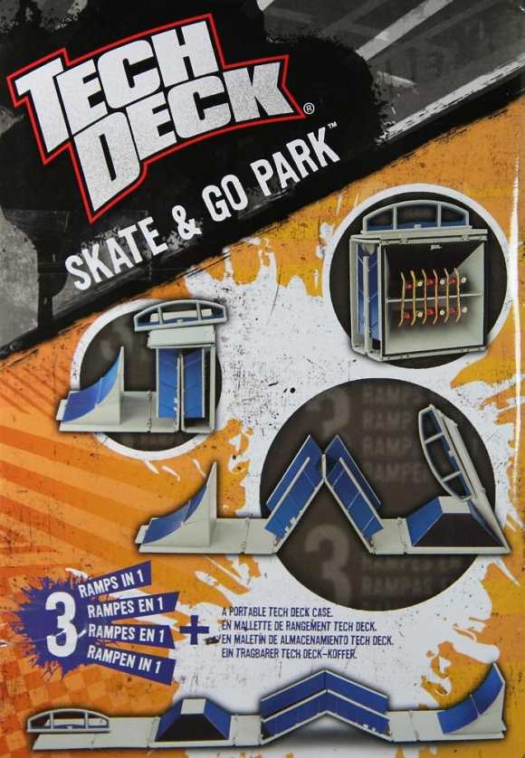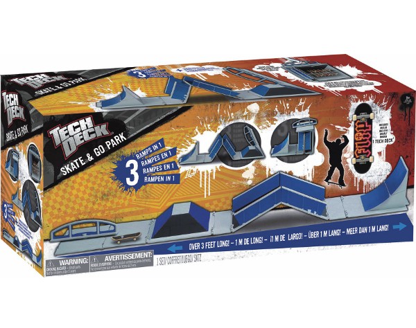 Zestaw Skacz i jedź zawiera 1 markową deskorolka 96 mm, rampę o długości ponad 90 cm ,którą można składać na 3 różne sposoby (pokazane na zdjęciu frontowym).Dodatkowo rampę można złożyć w walizkę do przenoszenia deskorolek Tech Deck.