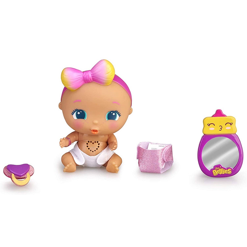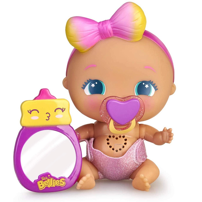 Bellie-Beth to śliczny interaktywny bobasek laleczka, która tylko czeka na to, by ktoś ją przytulił i pokochał. Każda dziewczynka pokocha prześliczne The Bellies. Zostań wspaniałą nianią i zaadoptuj wszystkie cztery laleczki. Laleczkę można nakarmić butelką, podać jej smoczek, zawinąć w kocyk lub przewinąć. Kiedy zdejmujesz plasterek z jej pępka, usłyszysz bicie małego serduszka, a Bellies natychmiast zaczynie gaworzyć. Każda z lalek robi to w inny, zabawny sposób. Zabawa laleczkami jest pełna niespodzianek: zdejmij pieluchę, a odkryjesz charakterystyczne znamię swojej Bellies: może to być gwiazdka lub serduszko, donat albo duszek. Ale to nie wszystko - jest jeszcze kolejna atrakcja, pieluszka skrywa zabawną niespodziankę. Sprawdź jej zawartość, następnie zobacz w Belliespedii co ona oznacza, aby dowiedzieć się, jakiej opieki potrzebuje Twoje dziecko.Taki bobasek to pierwsza okazja do rozwijania odpowiedzialności, opiekuńczości i empatii wobec drugiej osoby. Istnieje możliwość połączenia kilku laleczek ze sobą, aby zaczęły ze sobą rozmawiać.