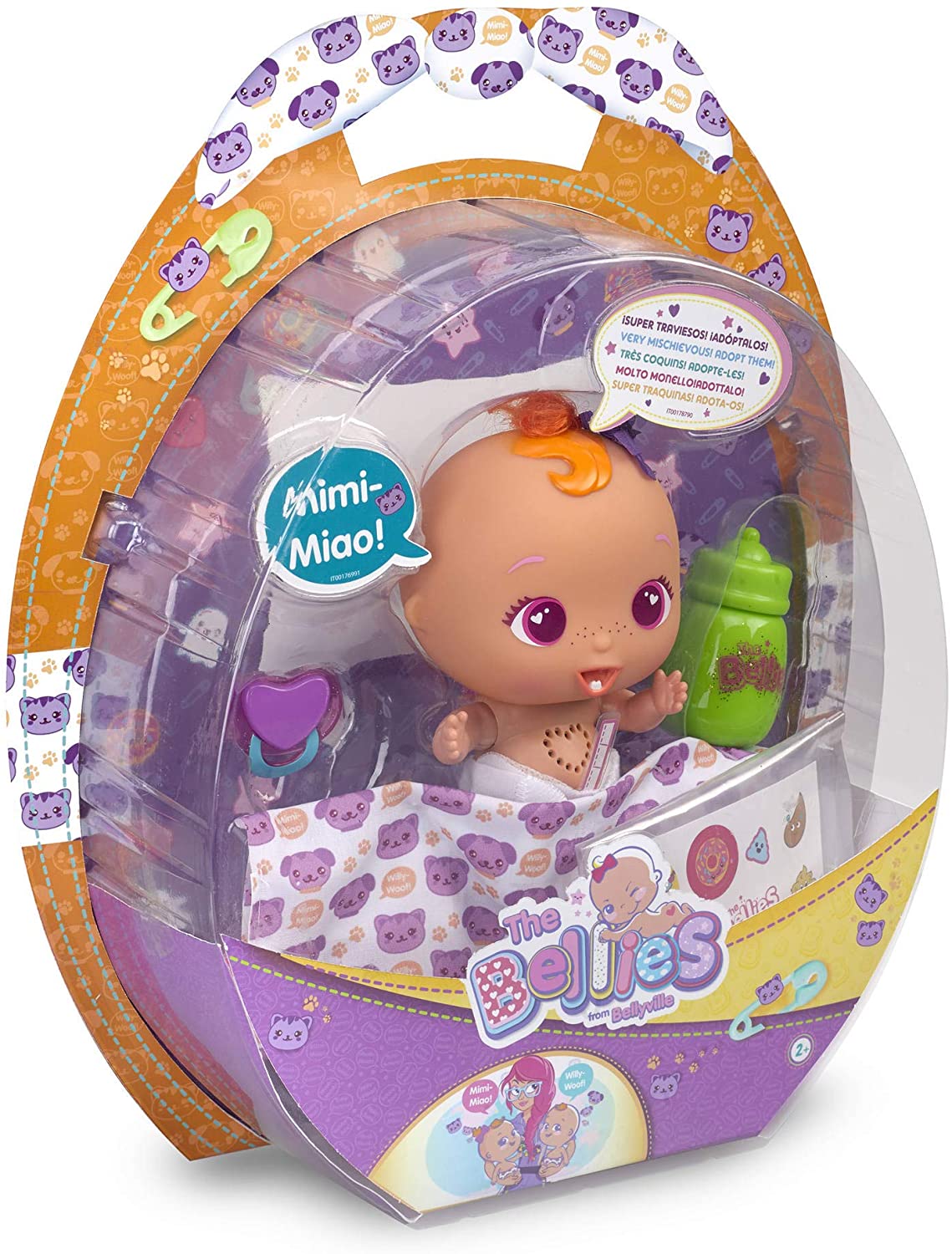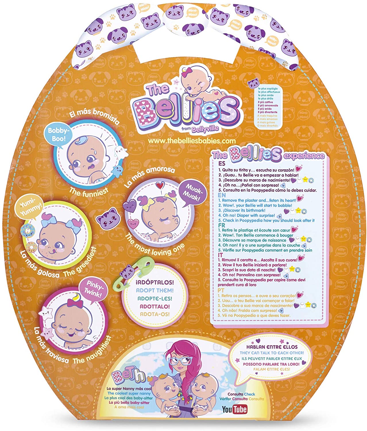 Bellie-Beth to śliczny interaktywny bobasek laleczka, która tylko czeka na to, by ktoś ją przytulił i pokochał. Każda dziewczynka pokocha prześliczne The Bellies. Zostań wspaniałą nianią i zaadoptuj wszystkie laleczki. Laleczkę można nakarmić butelką, podać jej smoczek, zawinąć w kocyk lub przewinąć. Kiedy zdejmujesz plasterek z jej pępka, usłyszysz bicie małego serduszka, a Bellies natychmiast zaczynie gaworzyć. Każda z lalek robi to w inny, zabawny sposób. Zabawa laleczkami jest pełna niespodzianek: zdejmij pieluchę, a odkryjesz charakterystyczne znamię swojej Bellies: może to być gwiazdka lub serduszko, donat albo duszek. Taki bobasek to pierwsza okazja do rozwijania odpowiedzialności, opiekuńczości i empatii wobec drugiej osoby. Istnieje możliwość połączenia kilku laleczek ze sobą, aby zaczęły ze sobą rozmawiać.