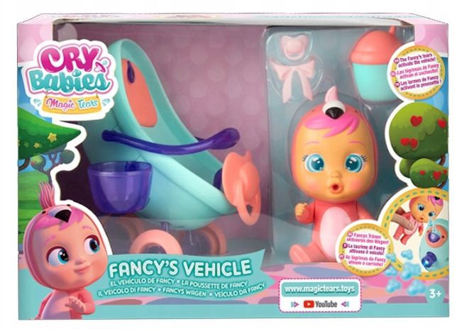 Laleczka Fancy płacze prawdziwymi łzami. Napełnij dołączoną buteleczkę wodą i nakarm Fancy. Potem delikatnie ściśnij jej brzuszek, aby płakała prawdziwymi łzami. Laleczka posiada swój wyjątkowy pojazd. Kiedy łzy laleczki wpadną do zbiorniczka, uruchamiają jego interaktywne funkcje. Zobaczysz jak para wodna wylatuje z rury wydechowej pojazdu, a światła się zaświecą. Wózek używać w dwóch pozycjach - jako spacerówkę lub po przechyleniu w dół jako wózek głęboki.