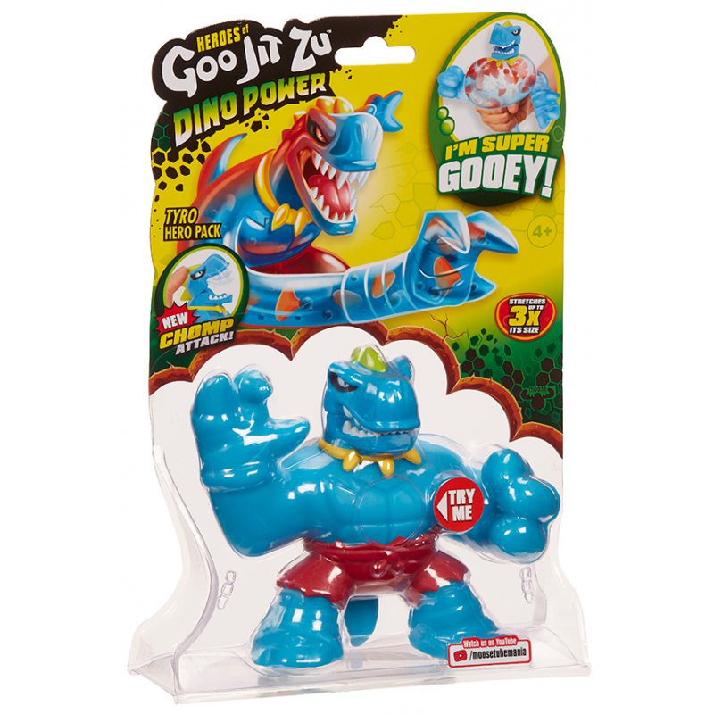Rozciągliwa Figurka Dino T-Rex Tyro to wojownik dinozaur, którego zwinność i siła przewyższa innych bohaterów. To niesamowicie silna postać, którego ciało jest wypełnione żelem, a jego kończyny potrafią rozciągnąć się trzykrotnie i powrócić do swojej pierwotnej formy.