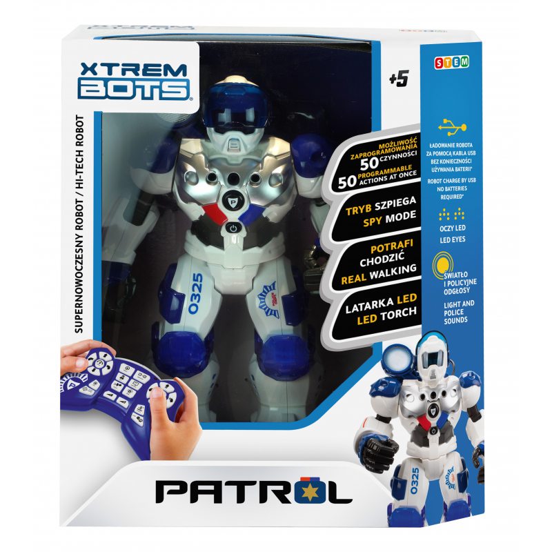 Patrol Bot to wyjątkowy robot policyjny, który może przeprowadzić nawet do 50 akcji. Dynamiczny i technologiczny design z dużym reflektorem na ramieniu to nie jedyne zalety tej futurystycznej zabawki. Twoje dziecko będzie zachwycone, gdy Patrol Bot zareaguje i wyrazi emocje swoją mimiką (oczy) lub zacznie wydawać autentyczne policyjne dźwięki! Wspólnie z dzieckiem nagraj dźwiękowe ostrzeżenie i postaw Patrol Bot’a na czatach, a gdy ten usłyszy niepokojące go dźwięki uaktywni się i odtworzy nagranie. To nieskończone możliwości zabawy, która nigdy się nie znudzi.
