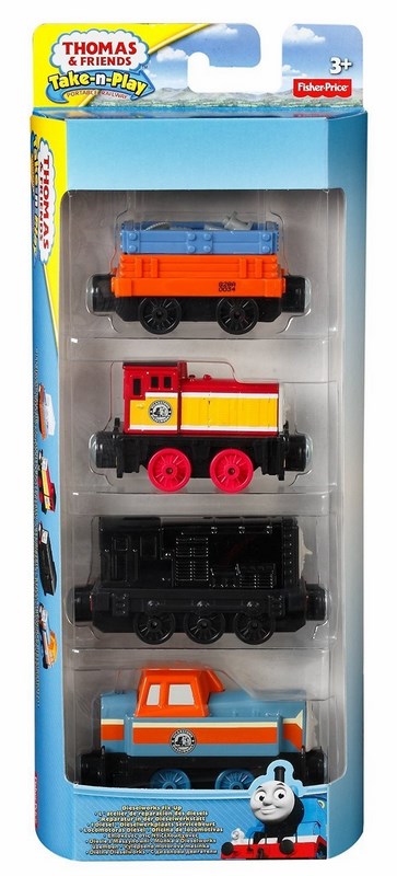Te wielopaki z serii Take-n-Play™ zawierają odlewane z metalu lokomotywki i pojazdy z serii „Tomek i Przyjaciele”. W każdym zestawie znajdują się cztery jeżdżące na kółkach pojazdy, które można łączyć ze sobą oraz z innymi lokomotywami z serii Take-n-Play™ dzięki magnesowym złączom.