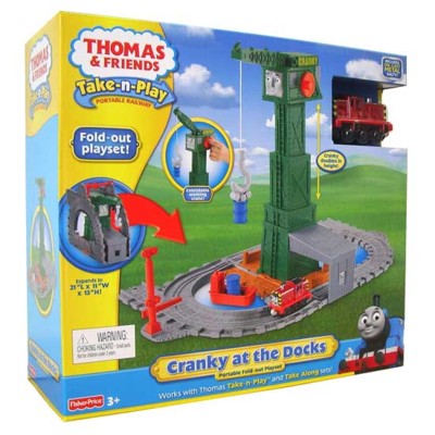 Żurawek Cranky z torami składany do walizeczki. Dźwig jest wysuwany teleskopowo, posiada pokrętło do wysuwania i chowania liny z hakiem (magnes), jest obracany wokół własnej osi. Tory z jednej strony posiadają dwa łączniki do sczepienia z innymi zestawami Take-n-Play.