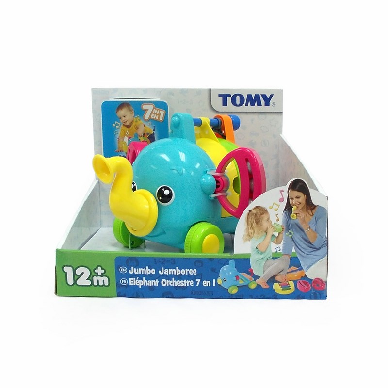 Zabawki TOMY dla najmłodszych to masa wesołej, aktywnej zabawy, która wywoła uśmiech na twarzy każdego dziecka. Słonik orkiestra to wspaniałe połączenie zabawki-słonika i instrumentów, które wprowadzą maluszka w świat muzyki! Nosek Słonika to trąba, uszy – dzwonki, a w korpusie znajdują się cymbałki, bębenek i harmonijka. Po zabawie łatwo jest złożyć zabawkę, jak kolorowe puzzle, a Słonik gdy jedzie popychany przez dziecko – macha uszami i trąbą!
