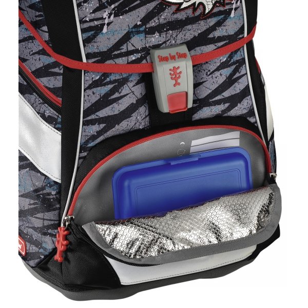 - Kieszeń z termofolią izolacyjną - Z przodu tornistra znajduje się kieszeń z folią termoizolacyjną, dzięki której ciepłe lub zimne przekąski tak szybko nie zmienią swojej temperatury i dłużej utrzymają świeżość. Dodatkowo kieszeń posiada dwa otwory odprowadzające rozlaną ciecz.