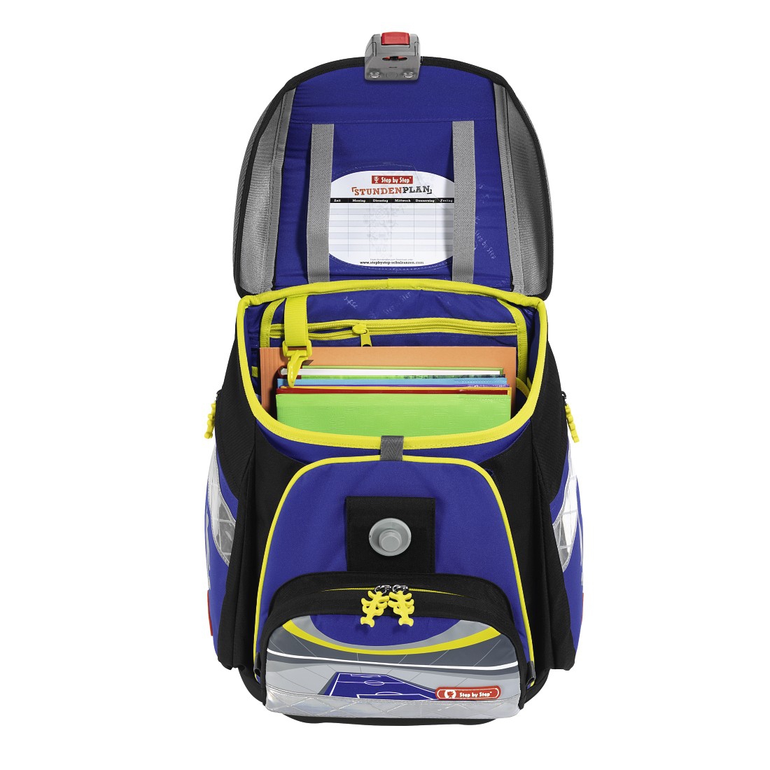 - Miejsce na plan lekcji - Do przezroczystej kieszonki można wsunąć wypełniony plan lekcji, tak by dziecko zawsze miało rozkład zajęć pod ręką. Miejsce na plan lekcji znajduje się pod pokrywą tornistra oraz w piórniku.