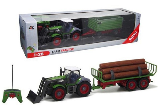 Traktor z drewnem na pilota 8301E to atrakcyjna zabawka dla najmłodszych miłośników pojazdów. Traktor posiada pełne sterowanie -tył, przód, lewo oraz prawo. Dodatkowo wyposażony jest w przyczepę do przewozu pni oraz przedni ładowacz. Przyczepa posiada korbę, która ułatwia jej podłączenie. Całość została wykonana z plastiku z metalowymi elementami oraz gumowymi oponami.