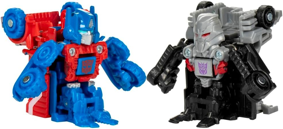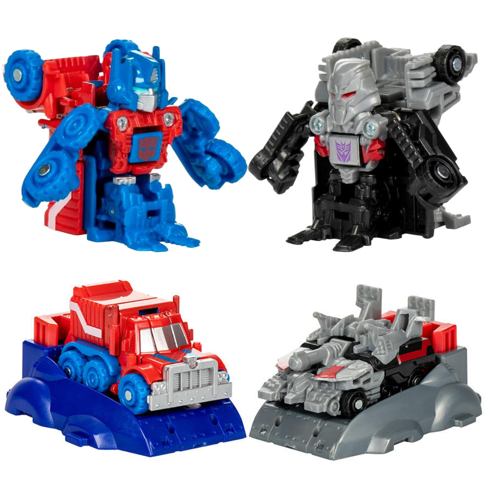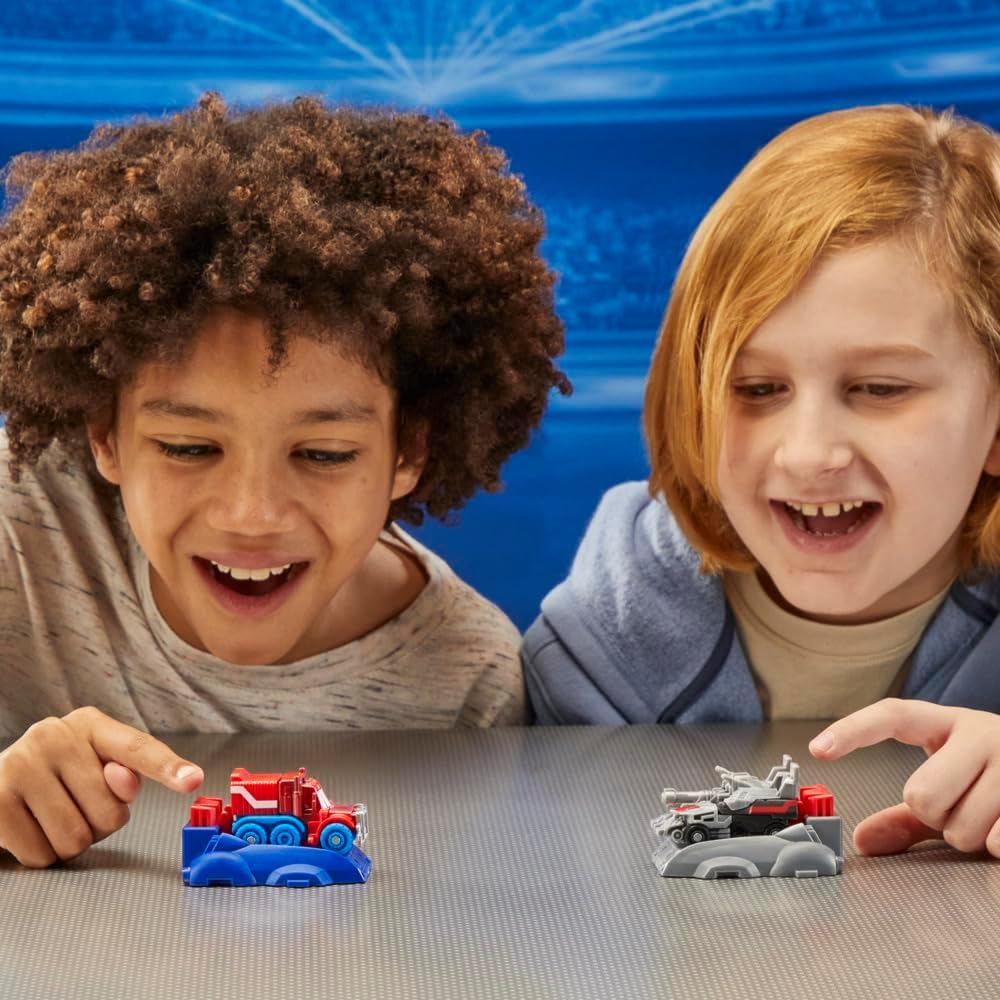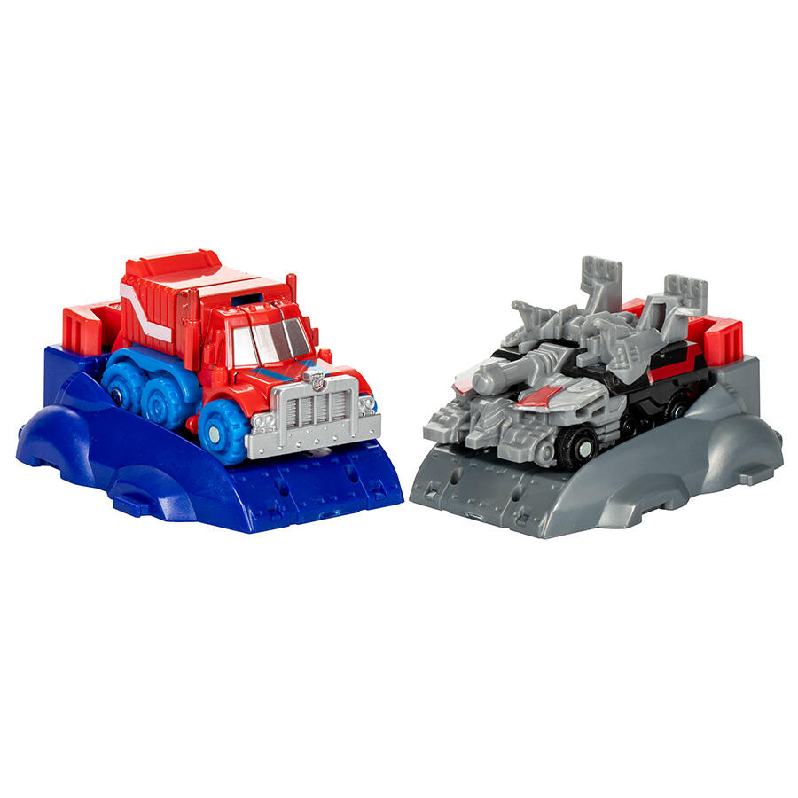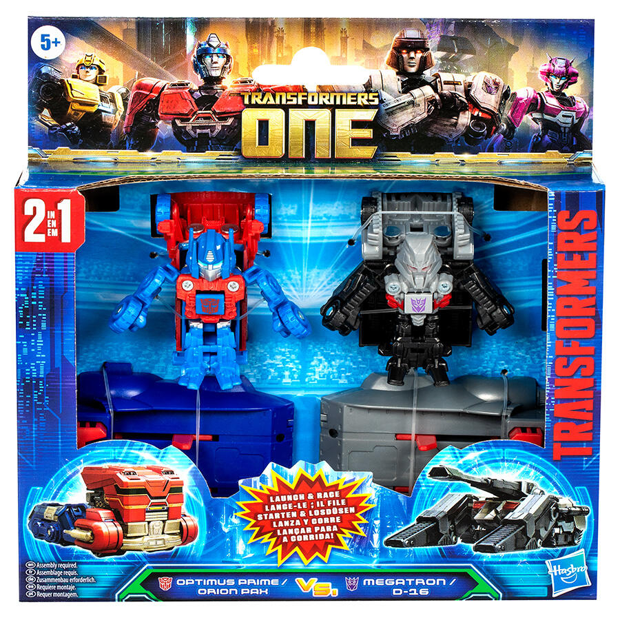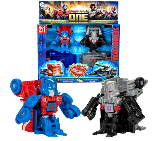 Poznaj epickie początki legendarnych robotów Transformers dzięki figurkom Transformers One Race Changers! Figurki Optimus Prime/Orion Pax i Megatron/D-16 można przekształcić z trybu robota w tryb pojazdu. Wystrzel je w kierunku siebie — gdy zderzą się, automatycznie przekształcą się w tryb robota. Ścigaj się nimi obok siebie, aby sprawdzić, który z nich dotrze najdalej i wygra wyścig!