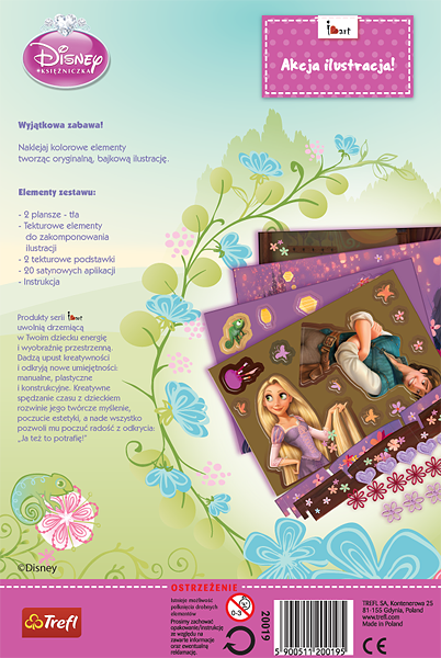 Wyjątkowa zabawa twórcza! Doskonali umiejętności w zakresie tworzenia kompozycji, rozwija poczucie estetyki. Ćwiczy precyzję oraz kształci małą motorykę ręki. Naklej postacie oraz elementy ozdobne na barwne tła. Upiększ warkocz Roszpunki oraz jej komnatę satynowymi aplikacjami. Starannie przyklej kolejne elementy. Użyj podstawki, aby wyeksponować obrazek.