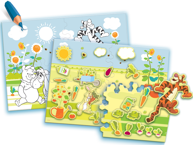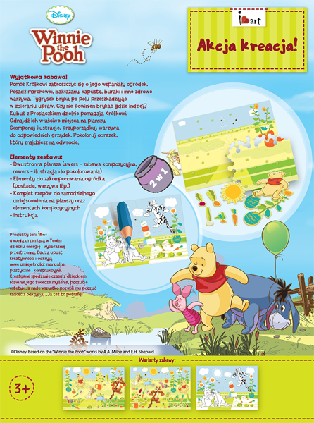 Wyjątkowa zabawa! Pomóż Królikowi zatroszczyć się o jego wspaniały ogródek. Posadź marchewki, bakłażany, kapustę, buraki i inne zdrowe warzywa. Tygrysek bryka po polu przeszkadzając w zbieraniu upraw. Czy nie powinien brykać gdzie indziej? Kubuś z Prosiaczkiem dzielnie pomagają Królikowi. Odnajdź ich właściwe miejsca na planszy. Skomponuj ilustrację, przyporządkuj warzywa do odpowiednich grządek. Pokoloruj obrazek, który znajdziesz na odwrocie.
