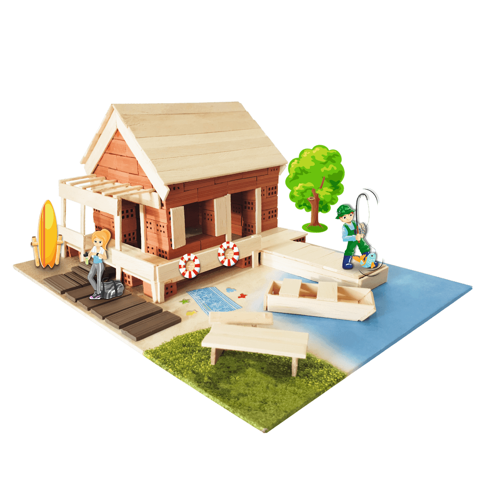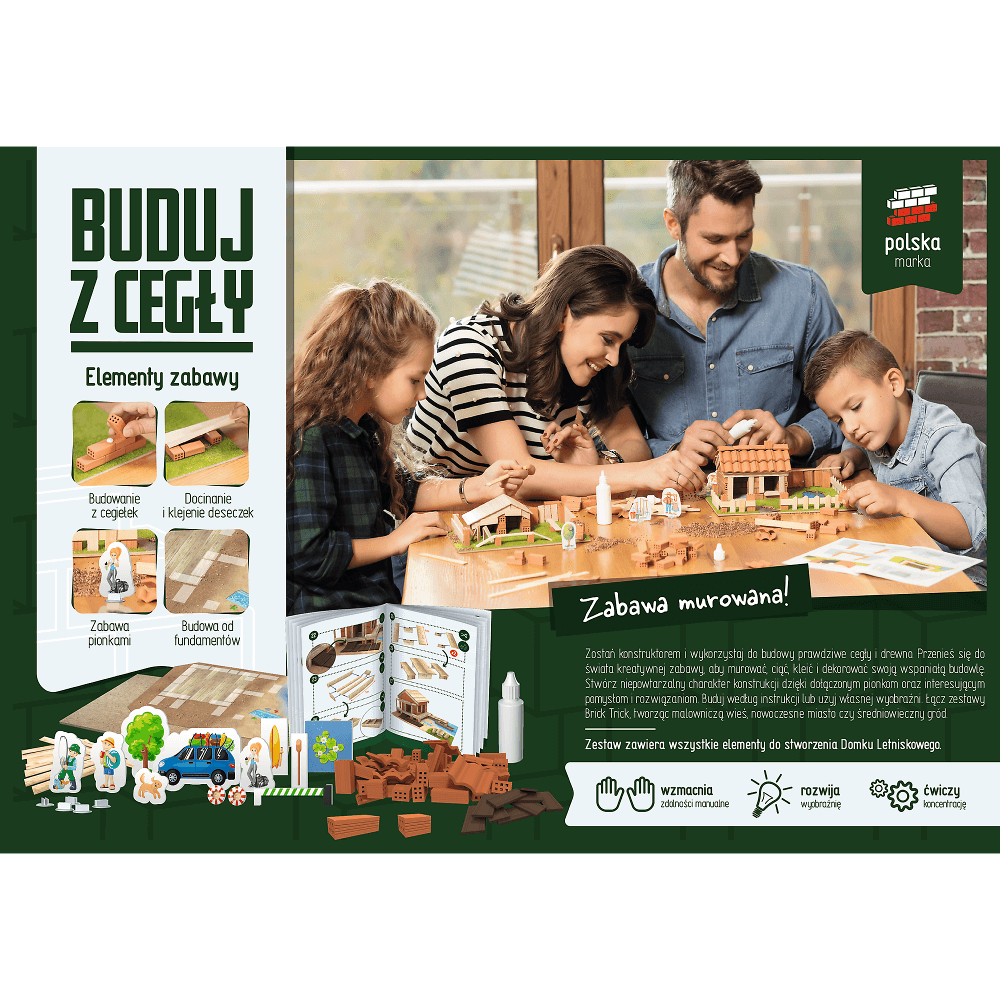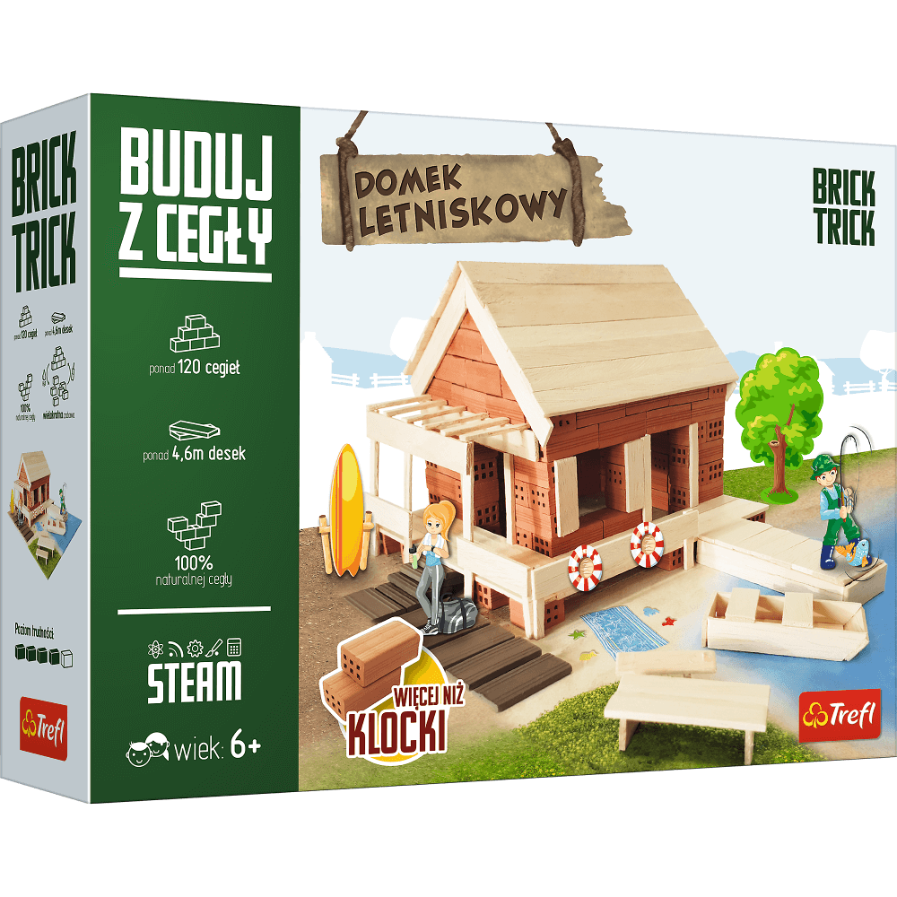 Wybuduj domek letniskowy serii Brick Trick, wykorzystując prawdziwe cegły, drewno i elementy dekoracyjne. Skorzystaj z dołączonych planów budowy lub użyj wyobraźni do stworzenia niepowtarzalnej konstrukcji. Baw się dołączonymi pionkami prosto z wiejskiego świata. To nie koniec zabawy! Rozpuść konstrukcję w wodzie i buduj dalej wykorzystując ponownie te same cegły! W zestawie znajdziesz: prawdziwe cegły, klej, drewniane deseczki, elementy dekoracyjne, pionki, podstawkę, naklejkę i instrukcję! Zabawa Murowana!