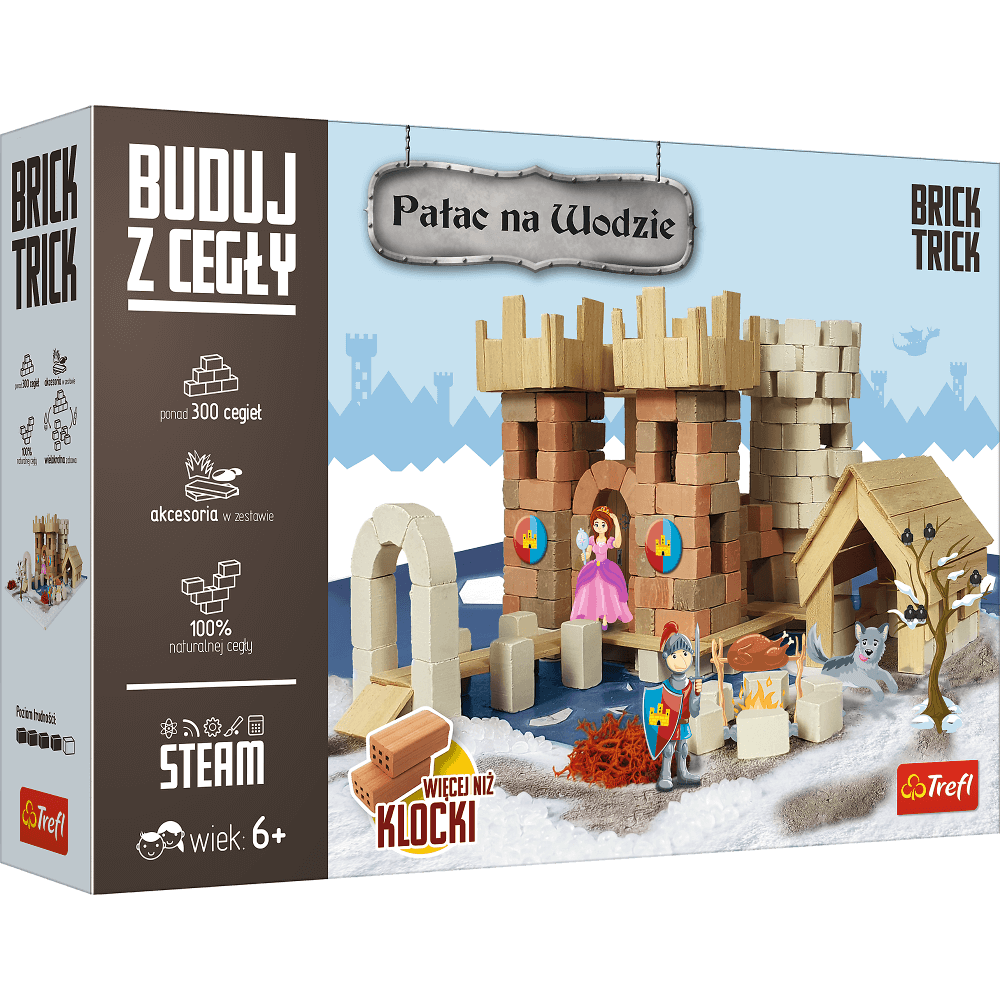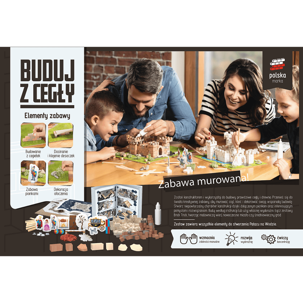 Wybuduj pałac na wodzie z serii Brick Trick wykorzystując prawdziwe cegły, drewno i elementy dekoracyjne. Skorzystaj z dołączonych planów budowy lub użyj wyobraźni do stworzenia niepowtarzalnej konstrukcji. To nie koniec zabawy! Rozpuść konstrukcję w wodzie i buduj dalej wykorzystując ponownie te same cegły! W zestawie znajdziesz: prawdziwe cegły, klej, drewniane deseczki, elementy dekoracyjne, pionki, podstawkę, naklejkę i instrukcję! Zabawa Murowana!