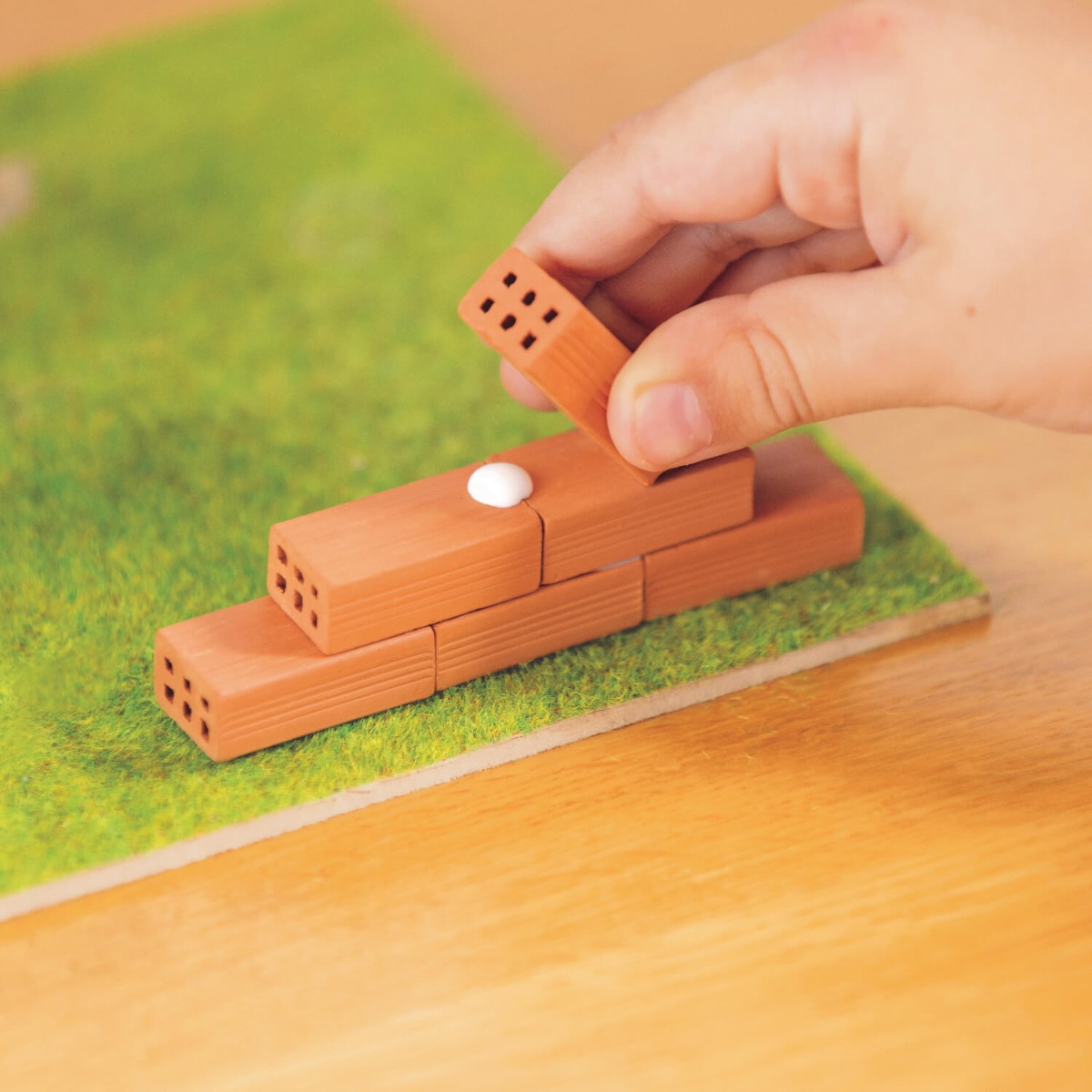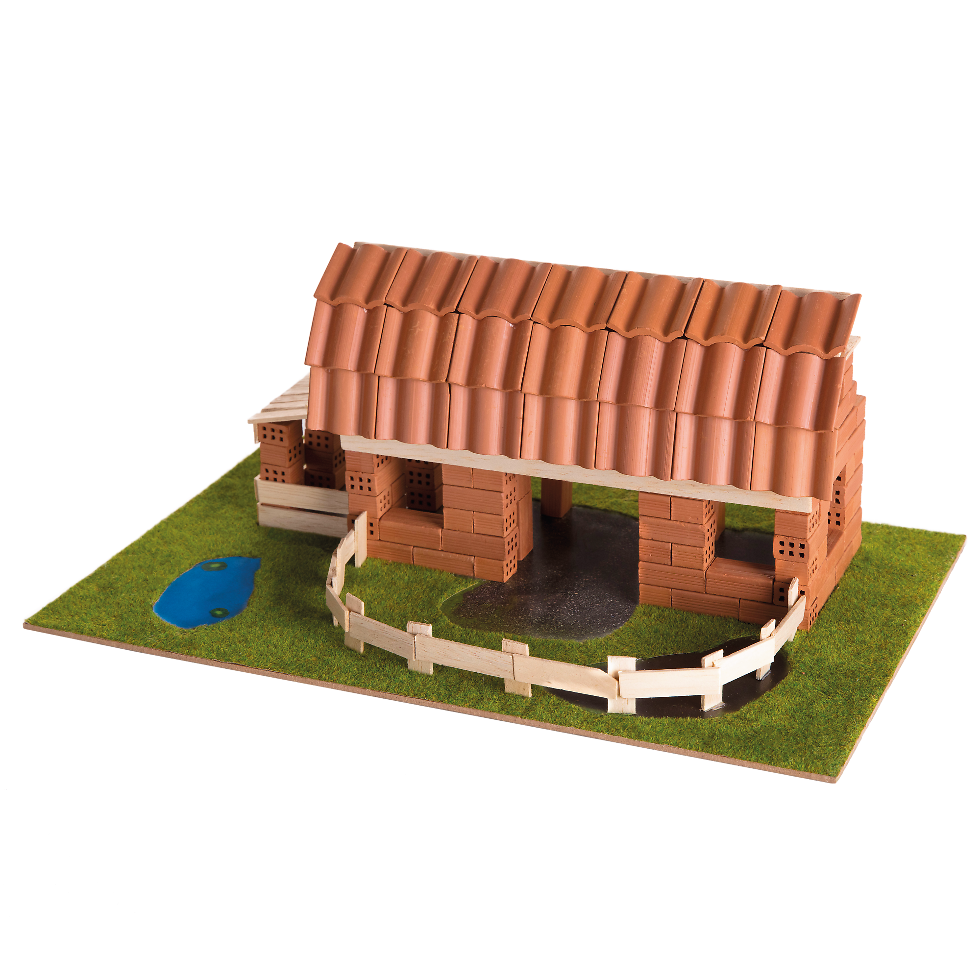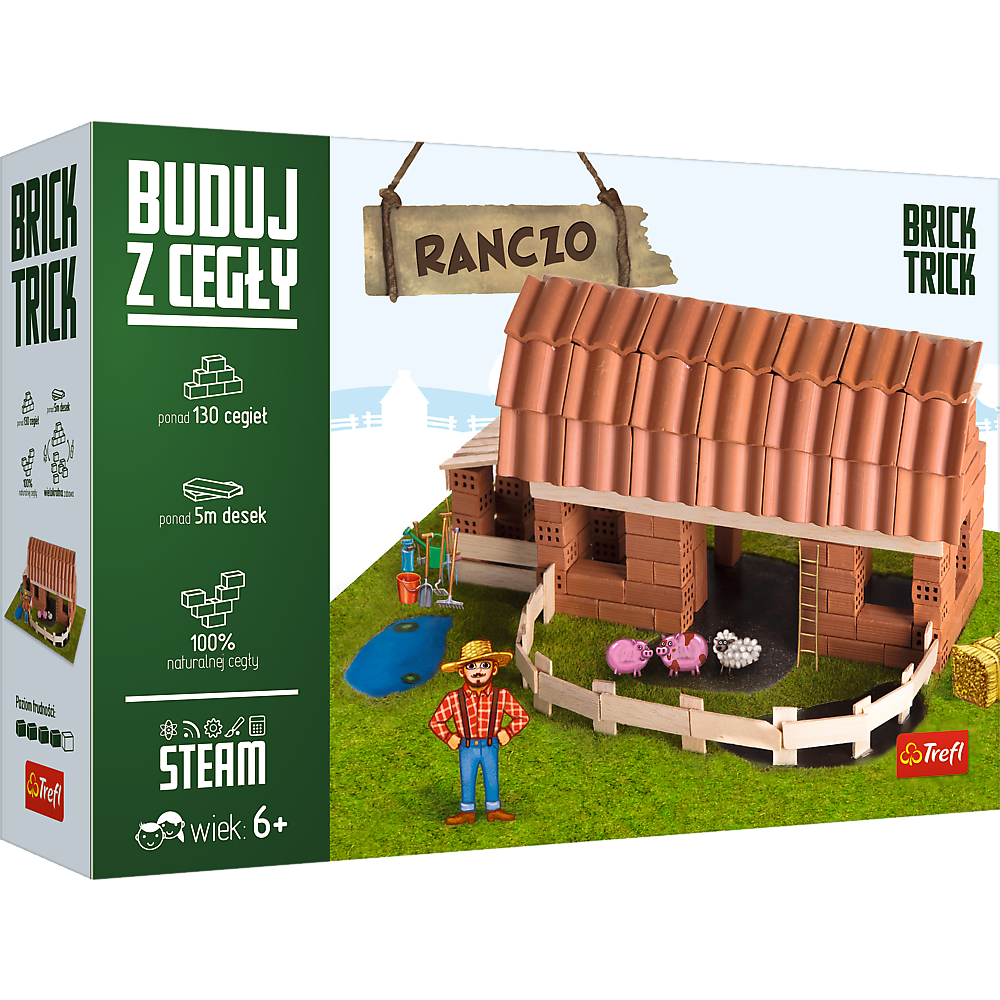 Wybuduj wspaniałe Ranczo wykorzystując prawdziwe cegiełki, drewno, a także naturalne elementy dekoracyjne jak trawę, korek czy krzew. Skorzystaj z dołączonych planów budowy lub użyj swojej wyobraźni do stworzenia wyjątkowych budynków. Baw się dołączonymi pionkami prosto z wiejskiego świata. Ale to nie koniec zabawy! Rozpuść konstrukcję w wodzie i buduj ponownie wykorzystując te same elementy! W zestawie znajdziesz wszystko, co potrzebne: naturalne cegły, klej, drewniane deseczki, elementy dekoracyjne, pionki, podstawkę, naklejkę i instrukcję! Z Brick Trick zabawa jest murowana!