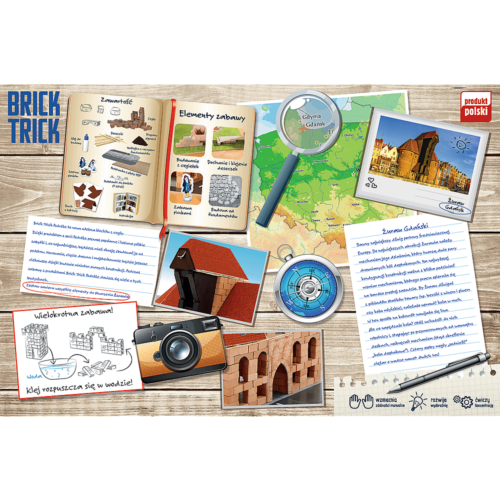 Myślisz Gdańsk – mówisz Żuraw! To jedna z najpopularniejszych atrakcji nadmorskiego miasta. Seria Brick Trick Podróże umożliwia Ci skonstruowanie tej charakterystycznej budowli w wersji „mini”. Ponad 6,5 metra deseczek drewnianych oraz pigment barwiący pozwolą na rzeczywiste odwzorowanie historycznego dźwigu portowego. Dodatkowe elementy z tektury, z których wykonasz bramę i dach, jak również pieczołowicie przygotowana naklejka z rozrysem fundamentu pozwolą Ci poczuć średniowieczny klimat Żurawia i całego Gdańska.