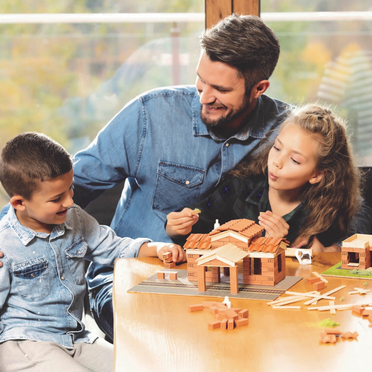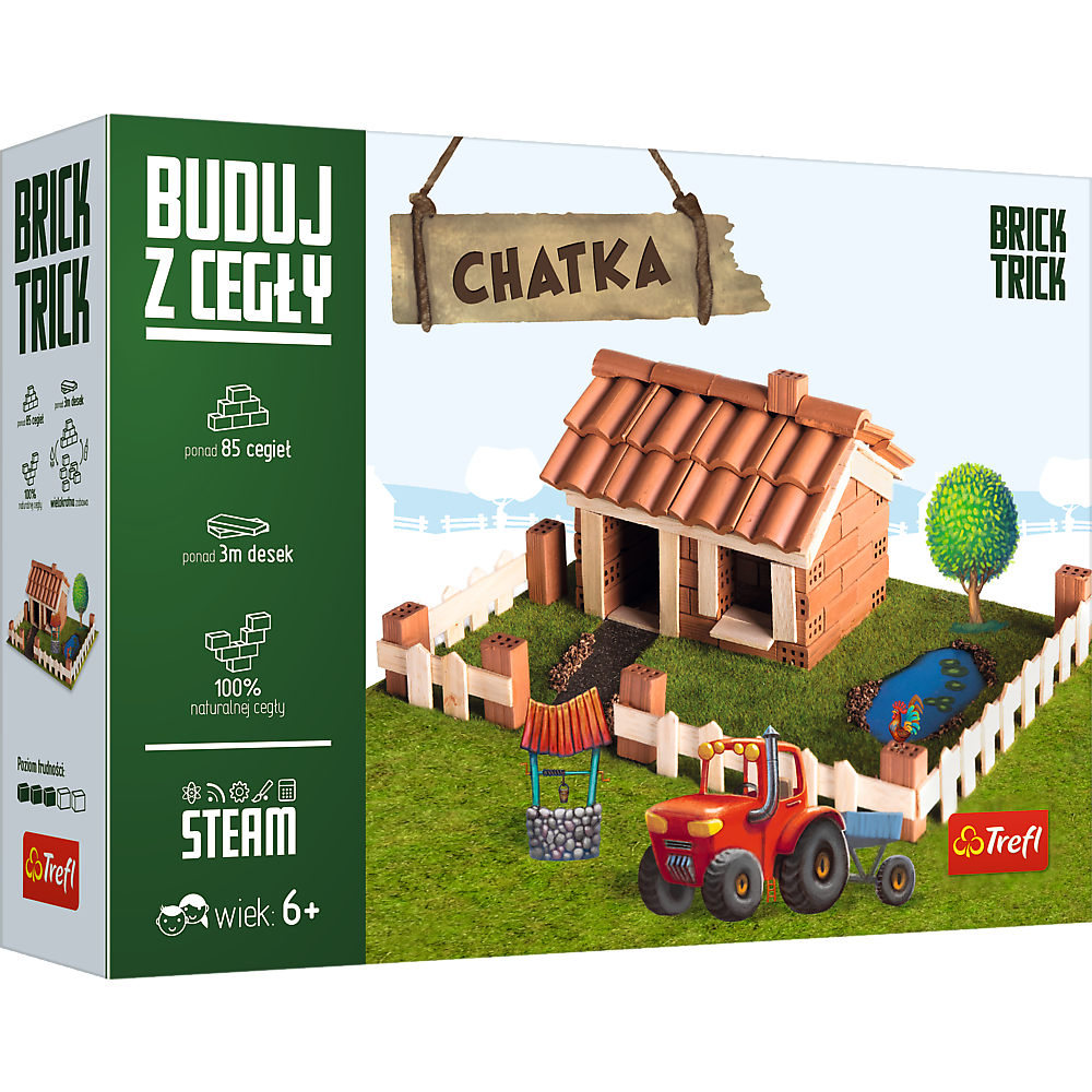 Wybuduj kameralną, wiejską Chatkę wykorzystując prawdziwe cegiełki, drewno oraz naturalne komponenty dekoracyjne jak trawę, korek czy krzew. Skorzystaj z dołączonych planów budowy lub użyj wyobraźni do stworzenia niepowtarzalnych obiektów. Baw się dołączonymi pionkami prosto z wiejskiego świata. Pamiętaj, że zabawa się nie kończy! Rozpuść konstrukcję w wodzie i buduj ponownie wykorzystując te same cegły! W zestawie znajdziesz naturalne cegły, klej, drewniane deseczki, elementy dekoracyjne, pionki, podstawkę, naklejkę i instrukcję! Zabawa z Brick Trick murowana!