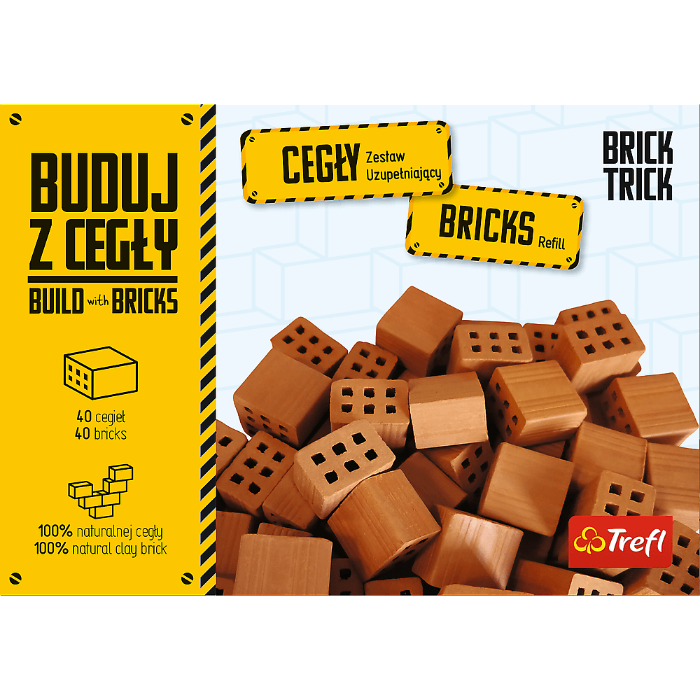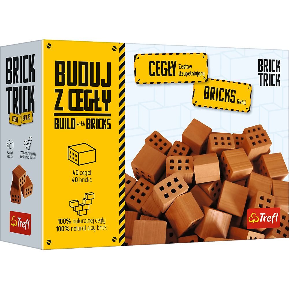Zestawy uzupełniające Brick Trick to produkty z linii kreatywnych zabawek konstrukcyjnych marki Trefl, w której głównym budulcem jest prawdziwa, naturalna cegła. Chcesz kontynuować zabawę i tworzyć więcej projektów? Zestawy Brick Trick są dla Ciebie znakomitym rozwiązaniem. Każde opakowanie zawiera 40 prawdziwych cegieł. Użyj wyobraźni i nadaj budowli niepowtarzalny charakter dzięki własnym pomysłom. Całe cegły, połówki cegieł, a może dachówki? Sprawdź wszystkie zestawy uzupełniające i baw się dalej.