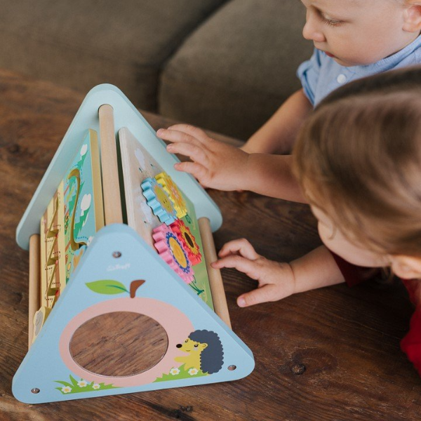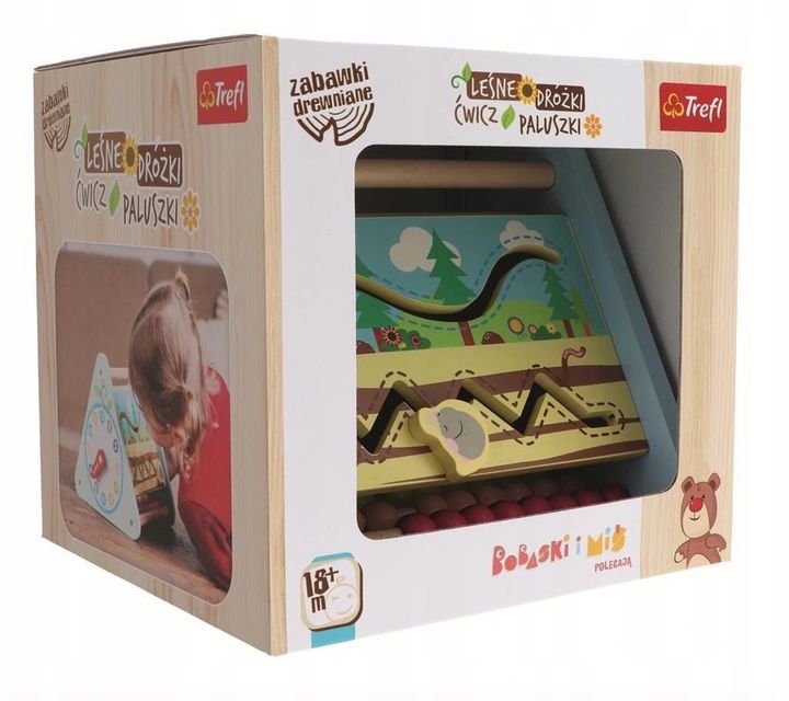 Leśne Dróżki Ćwicz Paluszki to drewniany box aktywacyjny składający się z 5 ścianek. Każda ścianka to nowe wyzwanie: mechanizm zębatkowy, zegar, tor do przesuwania zwierzątek, lusterko oraz liczydło.