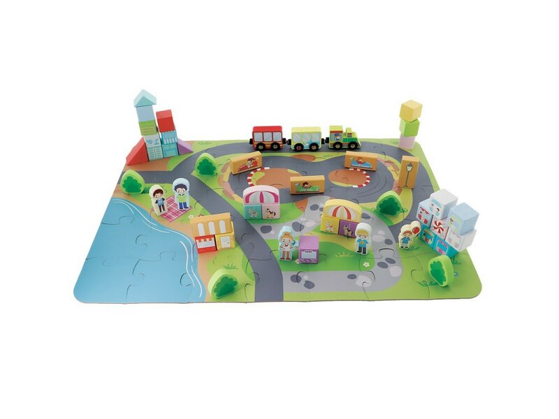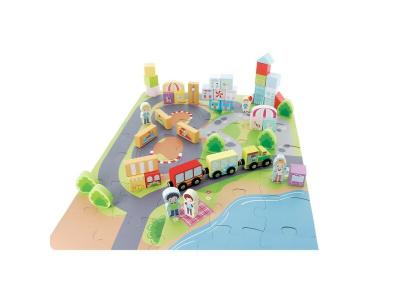 Edukacyjny zestaw 50 kolorowych klocków tematycznych z matą puzzlową, stworzony we współpracy z psychologiem, z myślą o potrzebach najmłodszych. Z kolorowych klocków zbuduj wesołe miasteczko. Drewniane klocki wspierają rozwój kreatywności, a figurki zachęcają do odgrywania ról. Kolejnym elementem zestawu jest mata puzzlowa o wymiarach 43 x 60 cm, która została zaprojektowana tak, by dziecko bawiąc się rozwijało umiejętności manipulacyjne rąk. Połącz zestaw z innymi zestawami z serii O!Klocki: MIASTO, ZOO i FARMA! Maty stworzą spójną grafikę. Stwórz świat według własnej koncepcji!