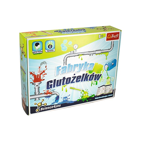 Fabryka Glutożelków to zestaw stworzony dla szalonych naukowców niebojących się wytworzyć z niebanalnych eksperymentów kolorowych robaczków, zwariowanej piłki, domowej ciastoliny i całej rodziny glutożelków. Przeczytaj zawartą w zestawie książeczkę i dowiedz się czym jest atom, cząsteczka i jakie są cechy polimerów, a później wykorzystaj tę wiedzę do tworzenia kolorowych robaczków, szalonej piłki, domowej ciastoliny i całej rodziny glutożelków. Odkryj w sobie cechy szalonego naukowca i stwórz niezwykły świat lepkich potworów! Zestaw pozwala na przeprowadzenie 17 eksperymentów.