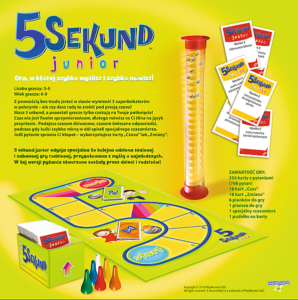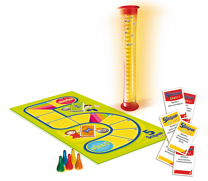 Z pewnością bez trudu jesteś w stanie wymienić 3 smaki dżemu - ale czy dasz radę zrobić to pod presją czasu? Masz jedynie 5 sekund, a pozostali gracze tylko czekają na Twoje potknięcie! Czas nie jest Twoim sprzymierzeńcem, dlatego mówisz co ci ślina na język przyniesie. Podajesz czasem dziwaczne, czasem śmieszne odpowiedzi, podczas gdy kulki szybko mkną w dół spirali specjalnego czasomierza. Jeśli pytanie sprawia ci trudności - wykorzystujesz karty "Czasu" lub "Zmiany". Na żółtej stronie kart znajdują się pytania dla młodszych dzieci, a na czerwonej dla starszych. 5 sekund - szalona i zabawna gra teraz w wersji junior stworzonej przez samych graczy!