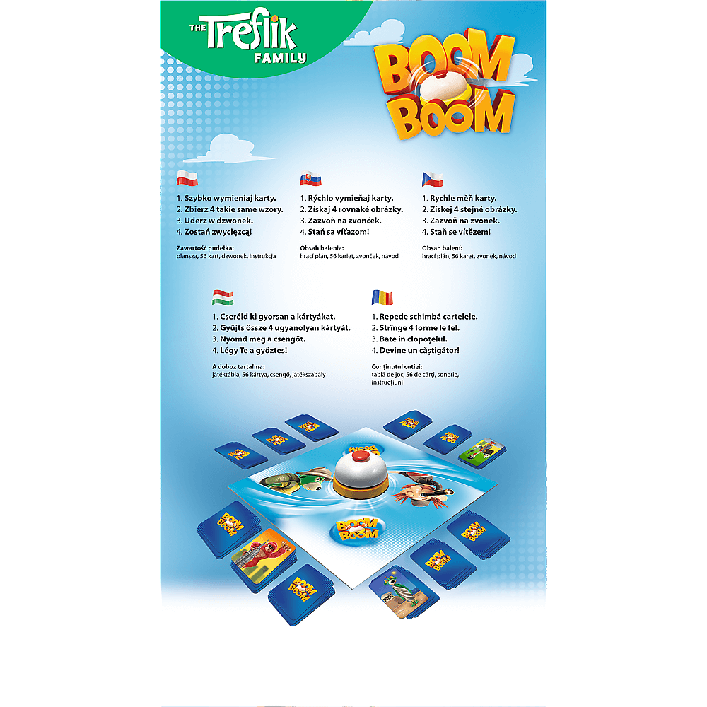 W nowej odsłonie gry Boom Boom gracze starają się zebrać identyczne karty z ulubionymi bohaterami z filmu Rodzina Treflików. Wszyscy gracze w tym samym czasie wymieniają karty z ręki z kartami znajdującymi się na planszy. Po zebraniu zestawu 4 takich samych kart gracz uderza w dzwonek, sygnalizując innym wykonanie zadania. Gracze mogą polować na karty przeciwników – kto okaże się najszybszy? Gracz, który jako pierwszy zbierze odpowiednie stosy takich samych kart, zostaje zwycięzcą!