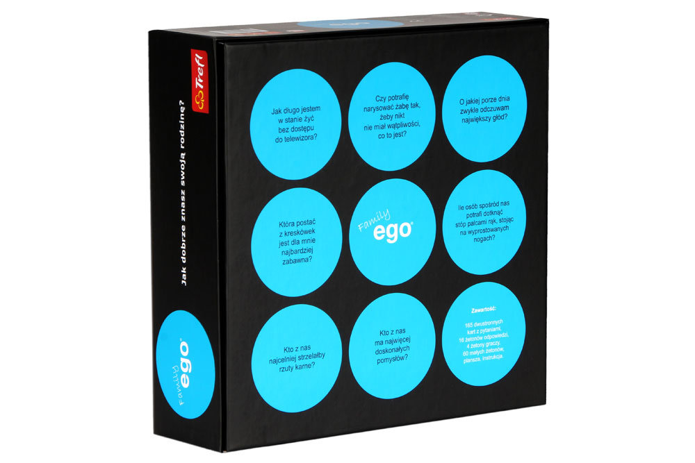 Sprawdź, czy dobrze znasz swoją rodzinę! Popularna gra towarzyska w rodzinnej odsłonie. Wyciągnij kartę z jednym z 330 niebanalnych pytań i wybierz odpowiedź. Pozostali gracze spróbują odgadnąć Twój wybór. Gracz, który najlepiej zna swoją rodzinę i zdobędzie najwięcej punktów, zostaje zwycięzcą. EGO Family to gra, która przede wszystkim ma zapewnić dobrą rozrywkę, ale dzięki niej pojawia się także możliwość porozmawiania o niektórych rzeczach i sprawach, które mogą umykać w życiu codziennym.
