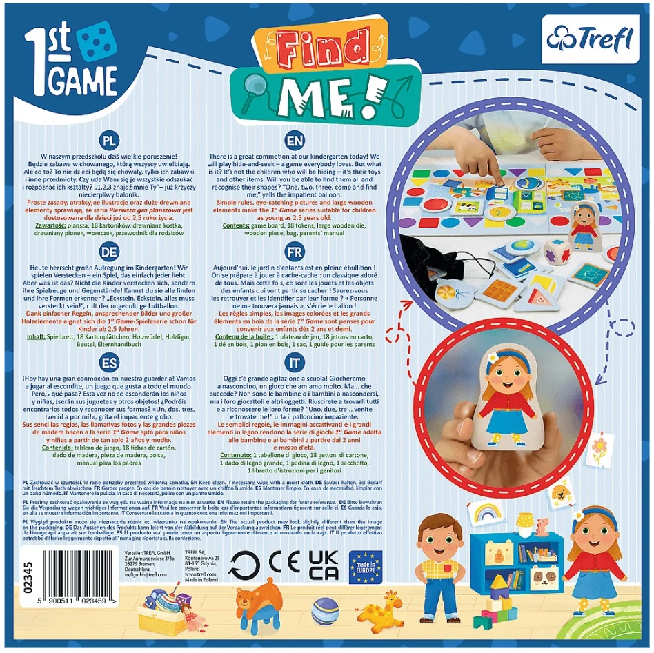 Pierwsza gra planszowa Find Me jest dostosowana dla dzieci już od 2,5 roku życia. Zawiera proste zasady, atrakcyjne ilustracje i duże drewniane elementy.