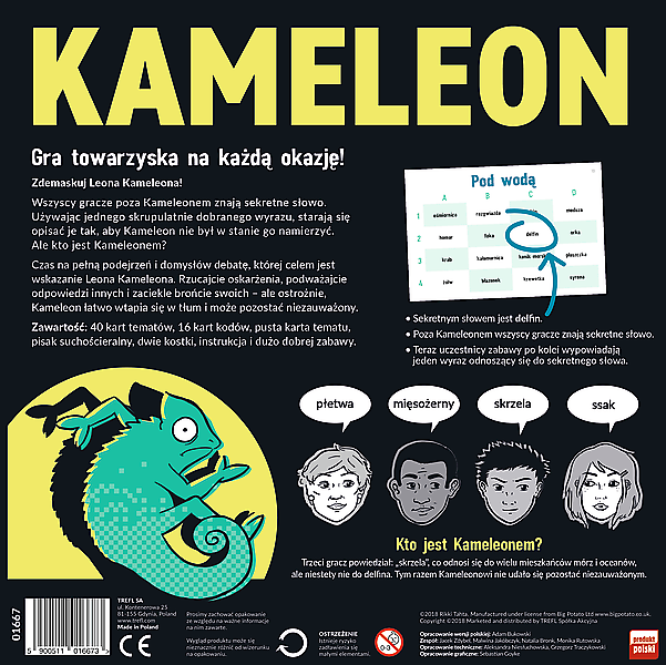 Gra towarzyska na każdą okazję! Wszyscy gracze poza Kameleonem znają sekretne słowo. Używając jednego skrupulatnie dobranego wyrazu, starają się opisać je tak, aby Kameleon nie był w stanie go namierzyć. Ale kto jest Kameleonem? Czas na pełną podejrzeń i domysłów debatę, której celem jest wskazanie Leona Kameleona. Rzucajcie oskarżenia, podważajcie odpowiedzi innych i zaciekle brońcie swoich – ale ostrożnie, Kameleon łatwo wtapia się w tłum i może pozostać niezauważony.