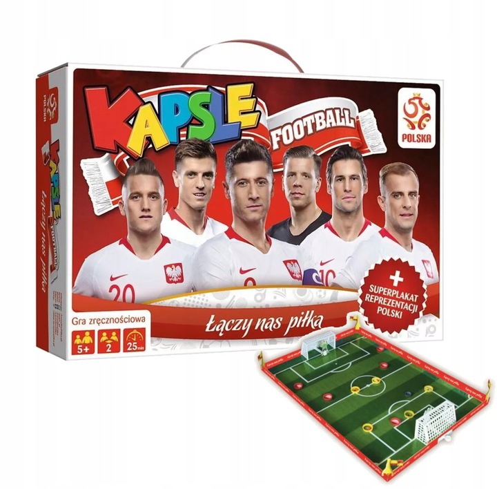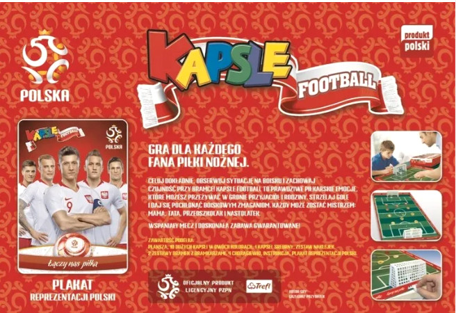 Gra Kapsle Football PZPN od firmy Trefl to gra dla każdego fana piłki nożnej. Strzelaj bramki i baw się doskonale w gronie przyjaciół i rodziny. Celuj dokładnie, obserwuj sytuację na boisku i zachowaj czujność przy bramce. Daj się pochłonąć boiskowym zmaganiom i zostań mistrzem. Każdy chętnie rozegra pełen emocji mecz i to w domowym zaciszu. Ta kultowa gra ma ciekawą formę, proste zasady i co ważne, potrafi łączyć pokolenia. Przywołuje w myślach młodość rodziców czy dziadków, a także zachęca dzieci do wspólnej zabawy.
