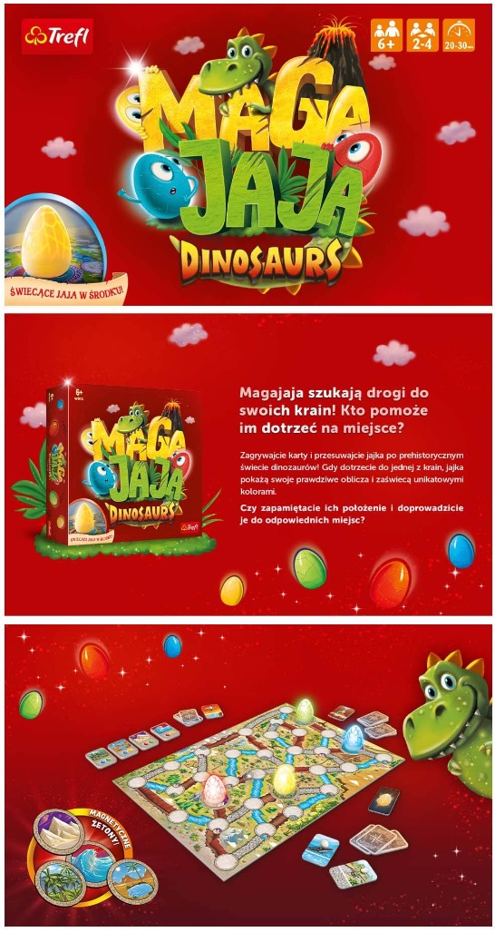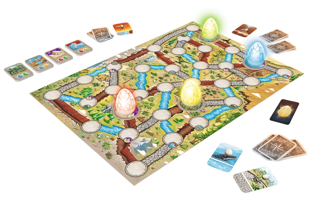 Gracze zagrywają karty i przesuwają jajka po prehistorycznym świecie dinozaurów. Kiedy dotrzecie do jednej z krain, jajka pokażą prawdziwe oblicza i zaświecą unikatowymi kolorami. Czy zdołacie zapamiętać ich położenie i doprowadzić do odpowiednich miejsc?