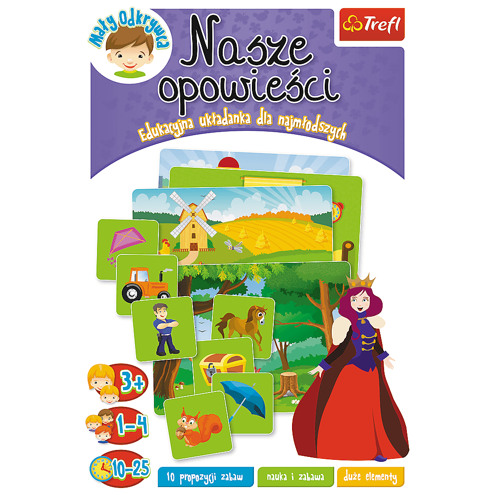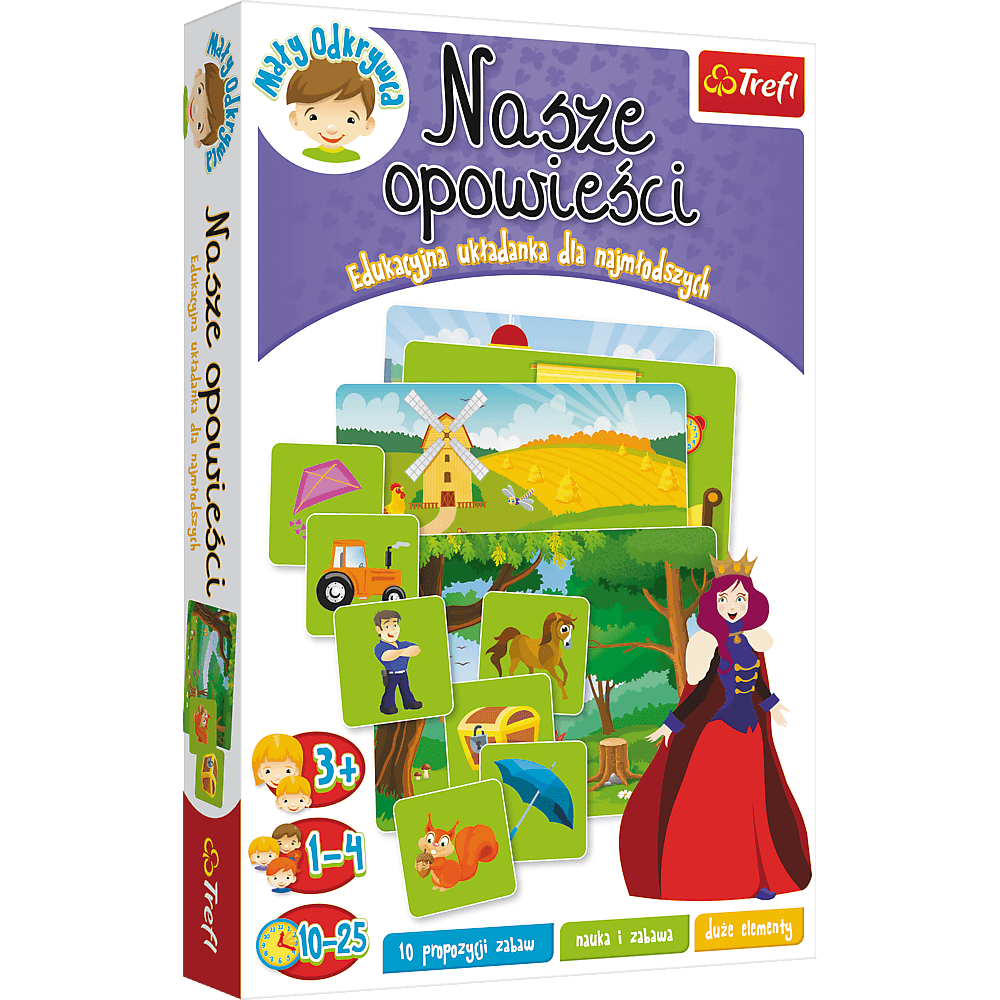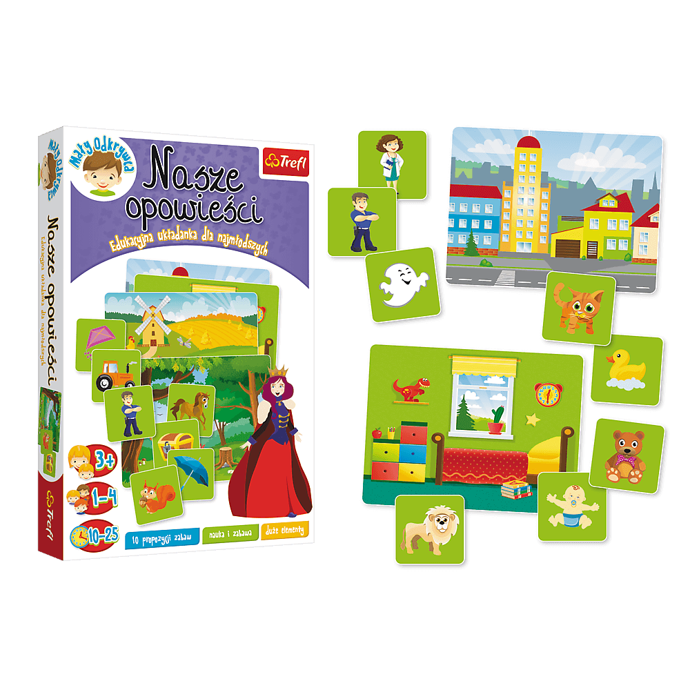 Nasze opowieści to edukacyjna gra i układanka dla przedszkolaków, która pobudza wyobraźnię i rozwija umiejętność opowiadania. Dzieci tworzą historie na podstawie wylosowanych elementów, ćwiczą kreatywność, znajdują nowe zastosowania dla posiadanego słownictwa.
