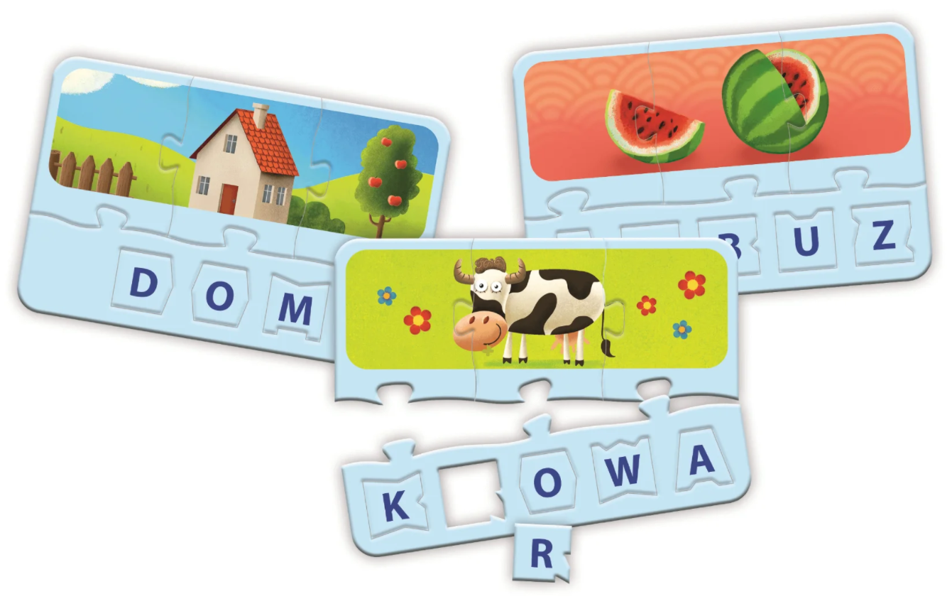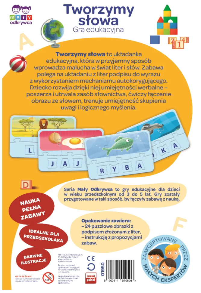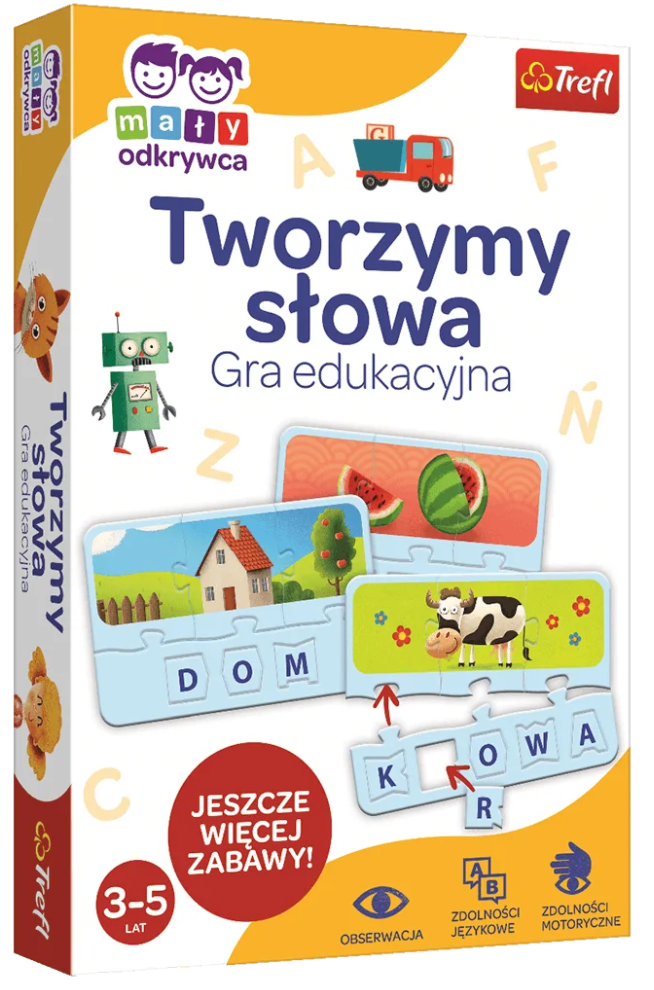 Tworzymy słowa to układanka edukacyjna z serii Mały Odkrywca, która w przyjemny sposób wprowadza malucha w świat liter i słów. Dziecko rozwija dzięki niej umiejętności werbalne – poszerza i utrwala zasób słownictwa, ćwiczy łączenie obrazu ze słowem, trenuje umiejętność skupienia uwagi i logicznego myślenia.