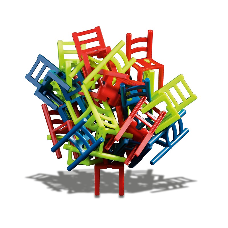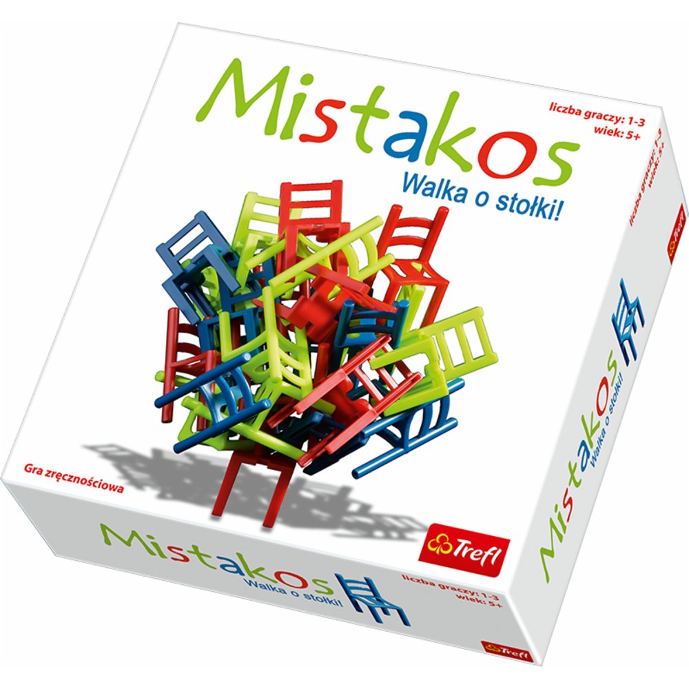 Gra Mistakos – walka o stołki!. Czas na zwariowane meblowanie! Wybierz krzesło w swoim kolorze i ustaw je na poprzednim tak, żeby nie spadło na stół. Kto pierwszy skusi i dostanie punkty karne? Świetna zręcznościowa zabawa dla graczy w każdym wieku. Zostań mistrzem konstrukcji krzesełkowych!