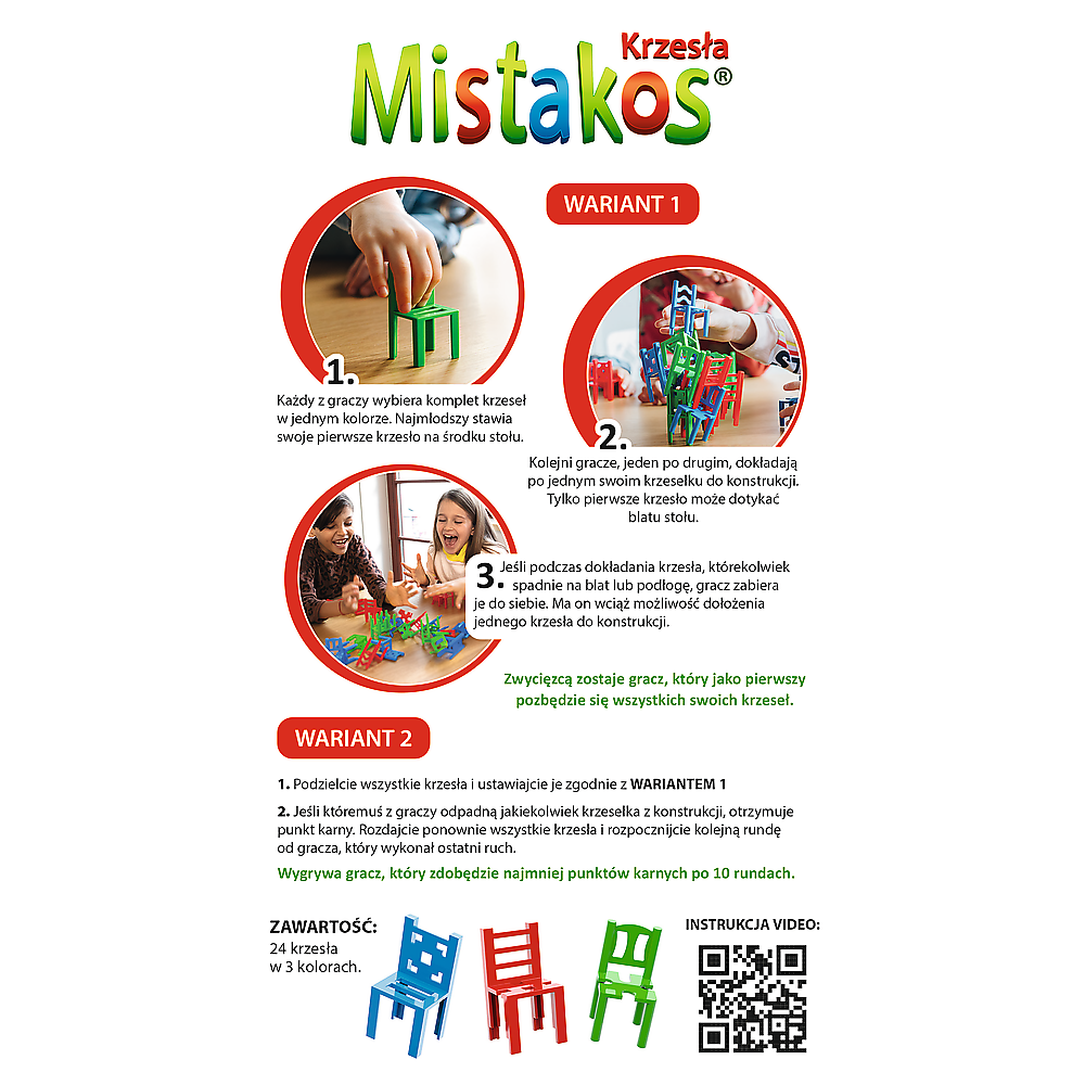 Na wielkim meblowaniu – i to dosłownie. W kartonowym opakowaniu znajdziesz zestaw 24 krzesełek w różnych kolorach: niebieskim, zielonym oraz czerwonym. Każdy gracz musi wykazać się bystrym okiem i zwinnymi palcami, by zostać mistrzem budowania wymyślnych konstrukcji.