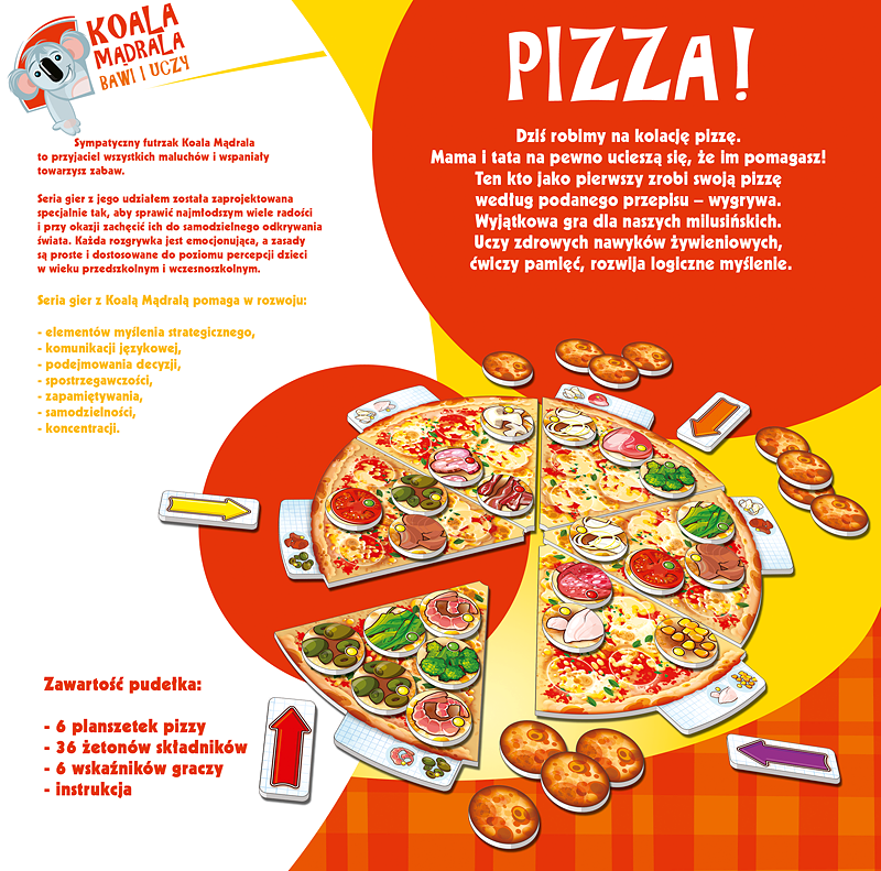 Gra Trefl Pizza Koala Mądrala sprawi, że dziś na kolację będzie pizza. Mama i tata na pewno ucieszą się, że im pomagasz! Ten kto jako pierwszy zrobi swoją pizzę według podanego przepisu przez Koalę Mądralę wygrywa. Pizza Koala Mądrala to wyjątkowa gra dla naszych milusińskich. Uczy zdrowych nawyków żywieniowych, ćwiczy pamięć, rozwija logiczne myślenie.