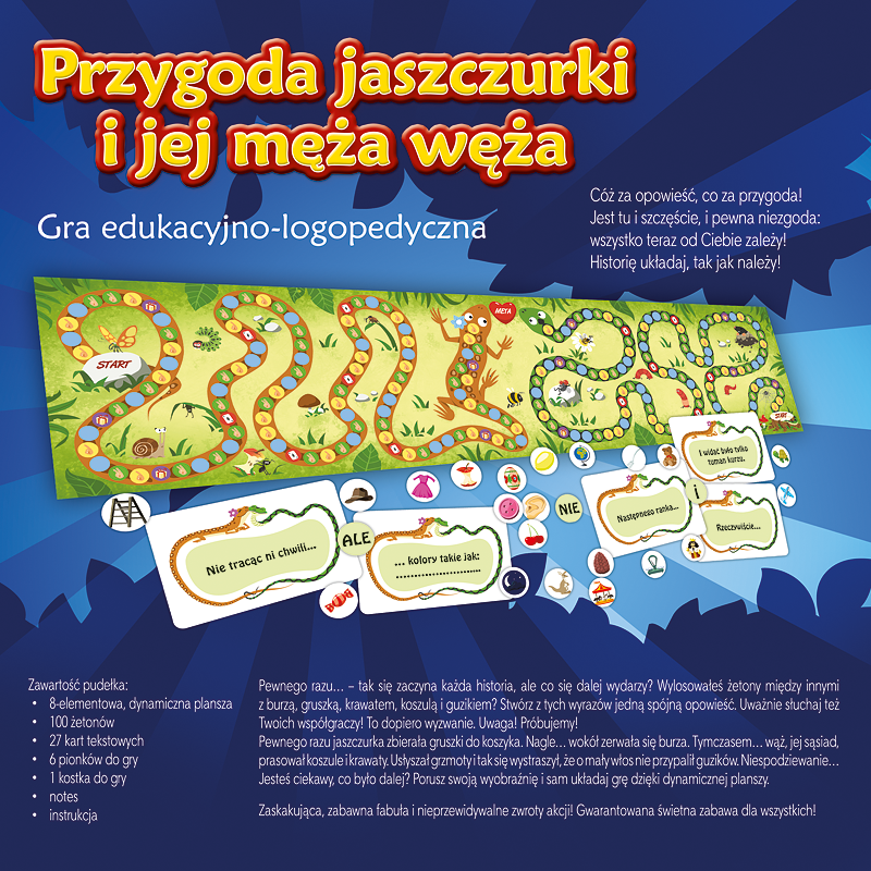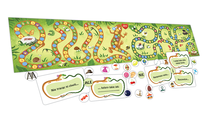 Cel gry: Porusz wyobraźnię i samodzielnie stwórz grę dzięki dynamicznej planszy oraz zestawowi 100 żetonów. Wymyśl jakie przygody czekają na Jaszczurkę i jej męża Węża.