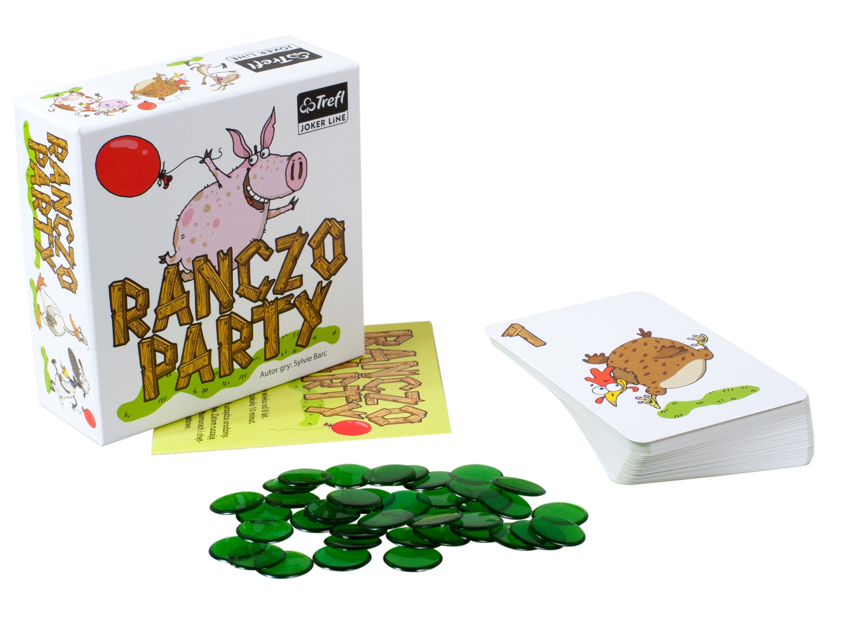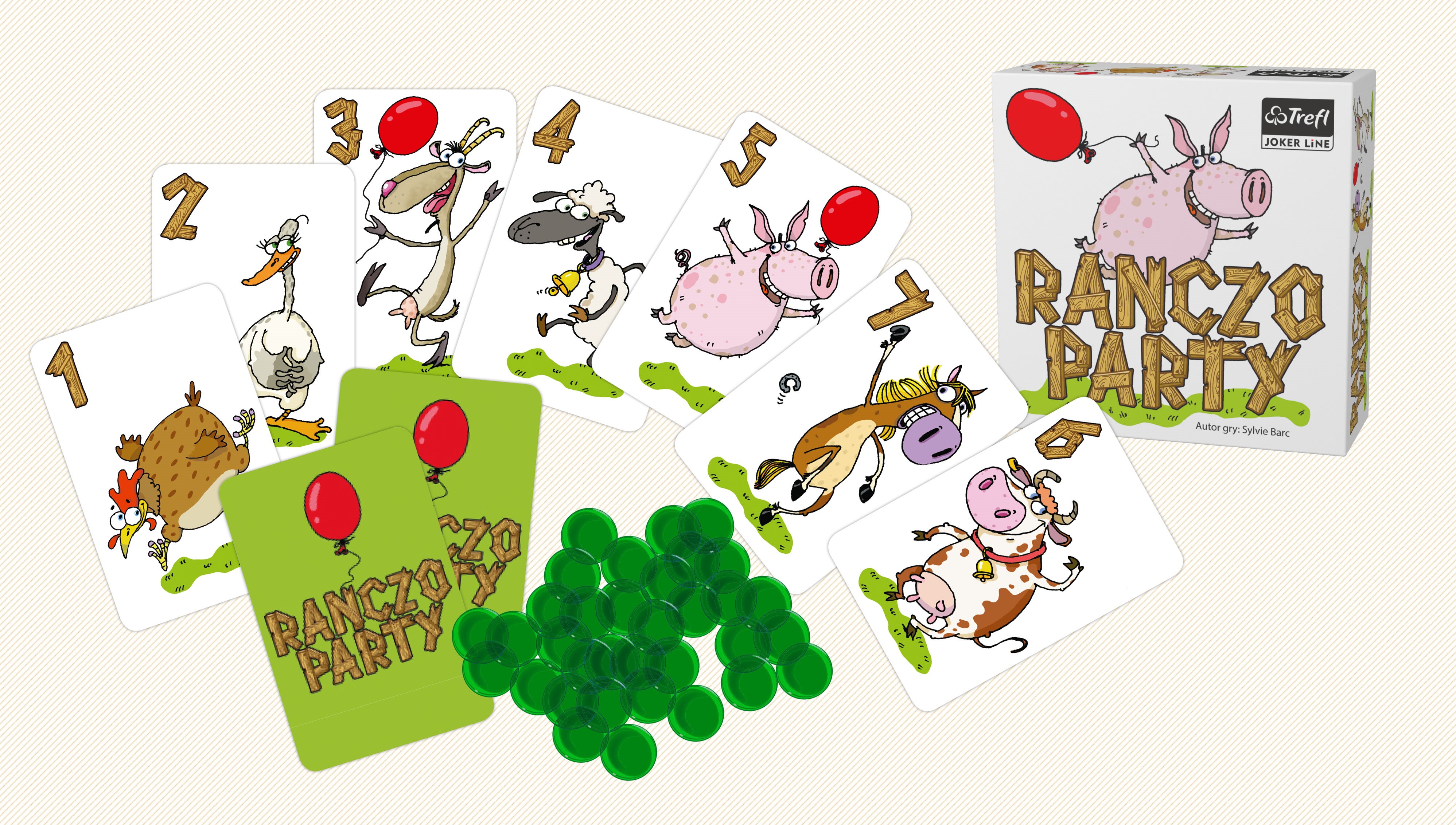 Ranczo Party to zabawna taktyczna układanka, która uczy planowania i pobudza logiczne myślenie. Zadaniem graczy jest kompletowanie wierszy i kolumn kart, przedstawiających zwierzęta gospodarskie udające się na huczne przyjęcie urodzinowe. Zbierają oni w ten sposób cenne punkty zwycięstwa, ale muszą przy tym uważać, by planując własne zagrywki, nie ułatwić zadania przeciwnikom. A kluczem do sukcesu jest… czerwony balonik. W trakcie rozgrywki emocje rosną jak w dobrym filmie akcji. Po skończonej grze wszyscy chcą grać drugi raz. I trzeci i czwarty.. Wesołe rysunki wywołują uśmiech na twarzy każdego ponuraka, a zgrabne pudełko zmieści się nawet w niewielkiej torebce!