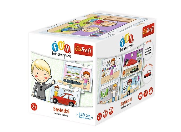 Sąsiedzi to duże, dwustronne klocki, które można układać w dowolnej kolejności. Dzięki temu dzieci tworzą za każdym razem inną historię i na nowo poznają mieszkańców kamienicy z ul. Wesołej. Zestaw zawiera specjalne opowieści i rymowanki stworzone z myślą o najmłodszych graczach. Rodzice znajdą w pudełku propozycje aż 12 ciekawych zabaw. Fun for everyone to nowe integracyjne produkty, które pobudzają wyobraźnię każdego dziecka. Dzieci dotykają, słuchają i patrzą, ucząc się, jak wygląda świat odkrywany różnymi zmysłami.