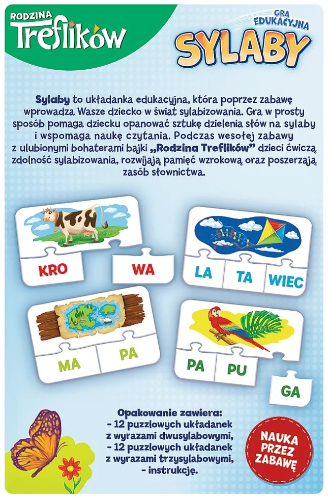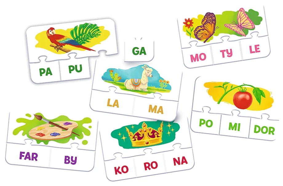 Sylaby to układanka edukacyjna, która poprzez zabawę wprowadza dzieci w świat sylabizowania. Gra w przyjemny sposób pomaga dzieciom opanować sztukę dzielenia słów na sylaby i wspomaga naukę czytania.
