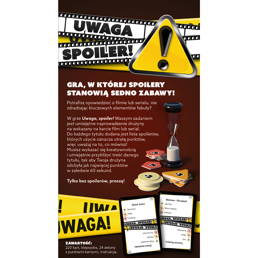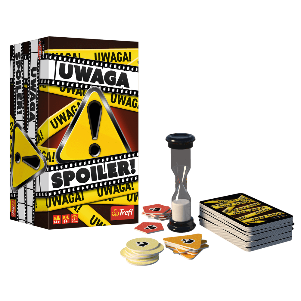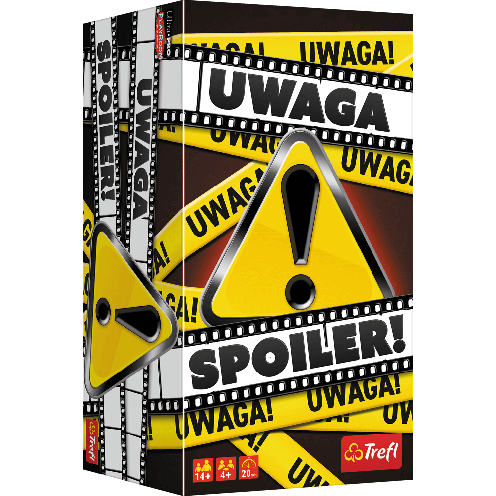 W grze towarzyskiej Uwaga, spoiler! zadaniem graczy będzie umiejętne naprowadzenie drużyny na wskazany na karcie film lub serial. Każdy z tytułów zaopatrzony jest listą spoilerów, których nie można użyć w trakcie rozgrywki. Jeśli zdarzy Ci się wypowiedzieć zakazany spoiler, stracisz punkty. Musisz się wykazać kreatywnością i umiejętnie przybliżyć dany tytuł, aby Twoja drużyna go odgadła i zdobyła jak najwięcej punktów. Macie na to tylko 60 sekund! Tyko bez spoilerów, proszę!