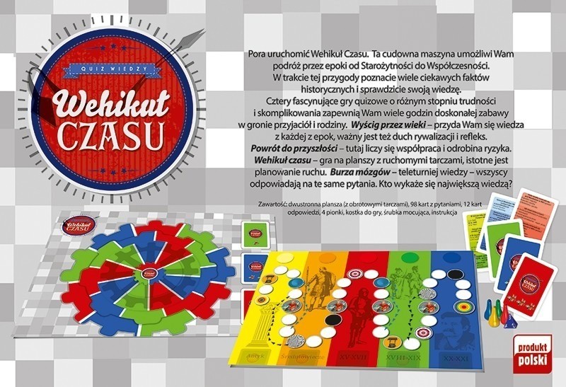 Wehikuł czasu pora na start! Ta cudowna maszyna umożliwi Wam podróż przez epoki od Starożytności do Współczesności. W trakcie tej przygody poznacie wiele ciekawych faktów historycznych i sprawdzicie swoją wiedzę. Cztery fascynujące gry quizowe o różnym stopniu trudności i skomplikowania zapewnia Wam wiele godzin doskonałej zabawy w gronie przyjaciół i rodziny.