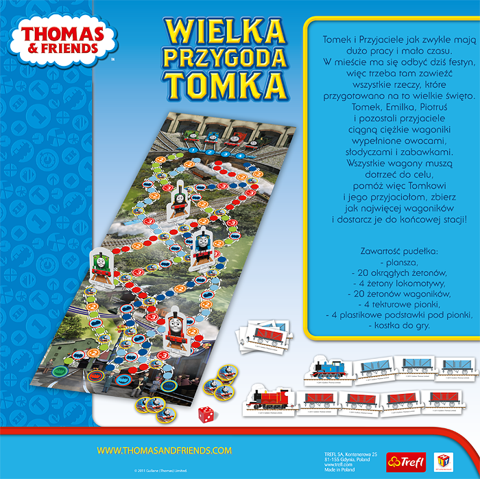Trefl Gra Wielka Przygoda Tomka to doskonałą propozycja dla wielbicieli bajki Tomek i Przyjaciele. W mieście ma się odbyć dziś festyn, więc trzeba tam zawieźć wszystkie rzeczy, które przygotowano na to wielkie święto. Tomek, Emilka, Piotruś z gry Trefl Wielka Przygoda Tomka ciągną ciężkie wagoniki wypełnione owocami słodyczami i zabawkami. Pomóż więc Tomkowi i jego przyjaciołom, zbierz jak najwięcej wagoników i dostarcz je do końcowej stacji! Dodatkowym atutem gry Wielka Przygoda Tomka jest ogromna plansza i super żetony.