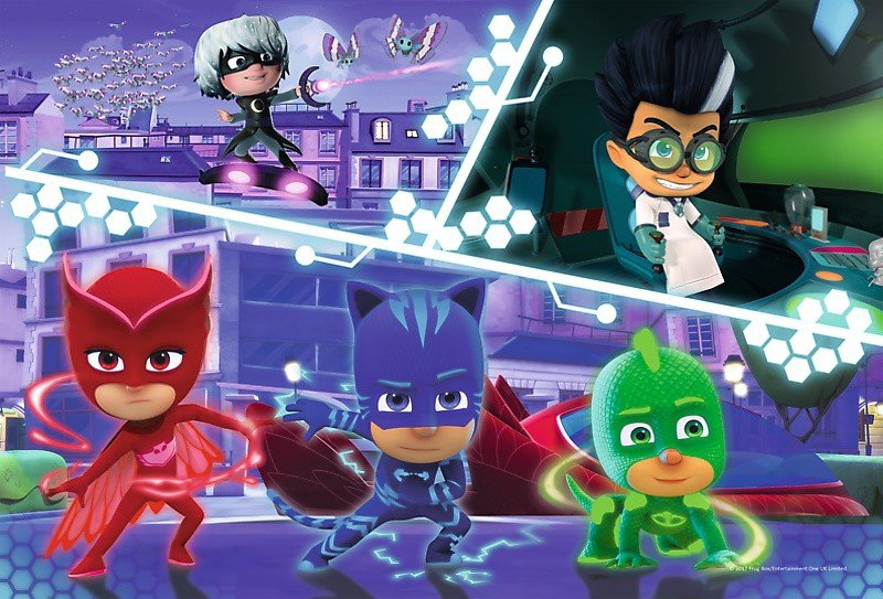 Puzzle 100 elementów z bohaterami bajki Pidżamersi. Po ułożeniu powstanie obrazek o wymiarach 41x27,5 cm. Wysoką jakość, nasycenie kolorów i bezpieczeństwo układania zapewnia papier odbijający światło, który pokryty jest ekologicznymi farbami spożywczymi.