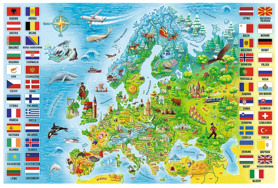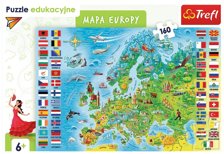 Puzzle edukacyjne - Mapa Europy, składające się z 160 elementów, to kolekcja, która zwróci uwagę zarówno dzieci, jak i ich rodziców. Prezentowane puzzle w przyjazny sposób łączą zabawę z nauką oraz pobudzają wyobraźnię i ciekawość świata.