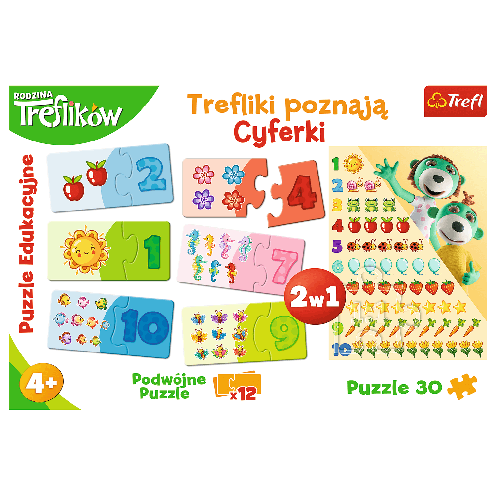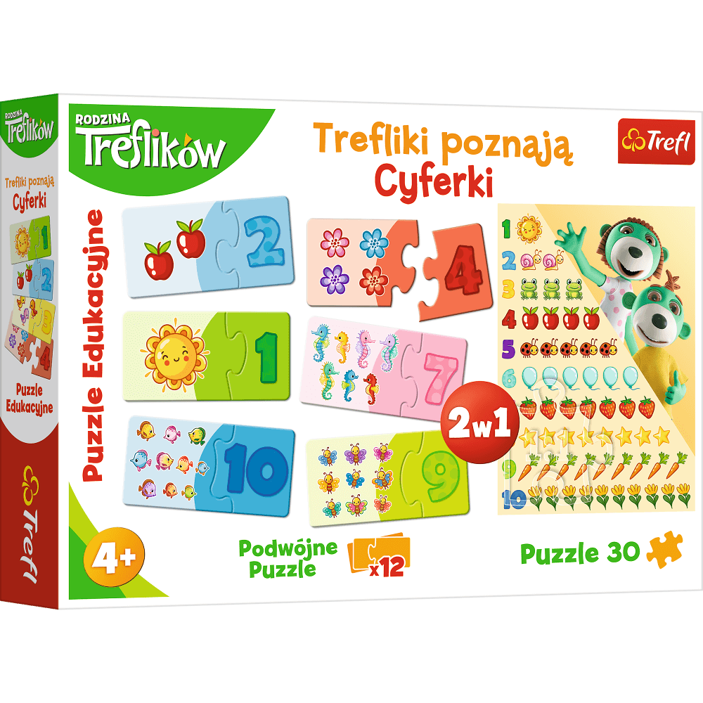 Trefliki poznają cyferki to wyjątkowa kolekcja puzzli edukacyjnych, która zwróci uwagę zarówno dzieci, jak i ich rodziców. Prezentowane puzzle w przyjazny sposób łączą zabawę z nauką oraz pobudzają wyobraźnię i ciekawość świata. Układanki zostały specjalnie dostosowane do możliwości poznawczych dzieci w różnym wieku. Puzzle zostały zaprojektowane na podstawie licencji serialu dla dzieci pt. Rodzina Treflików.