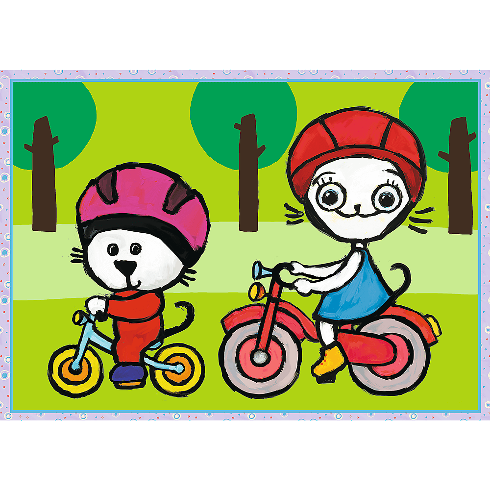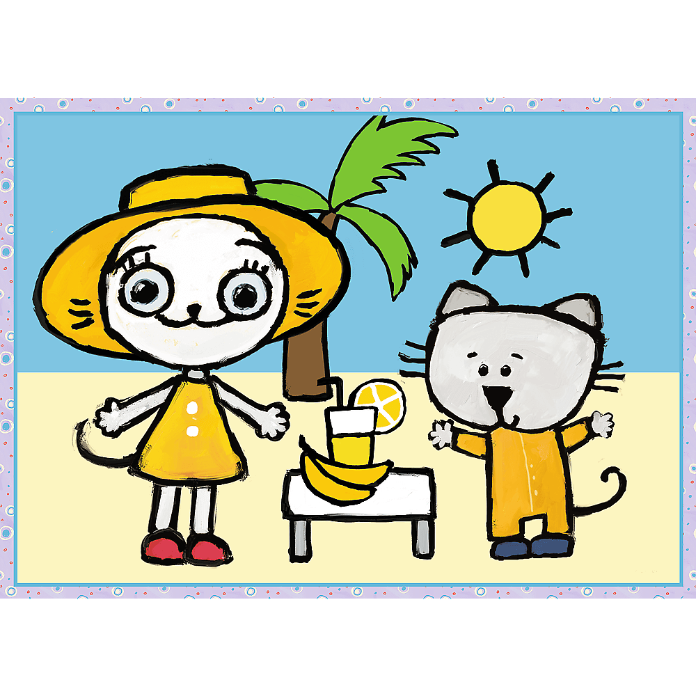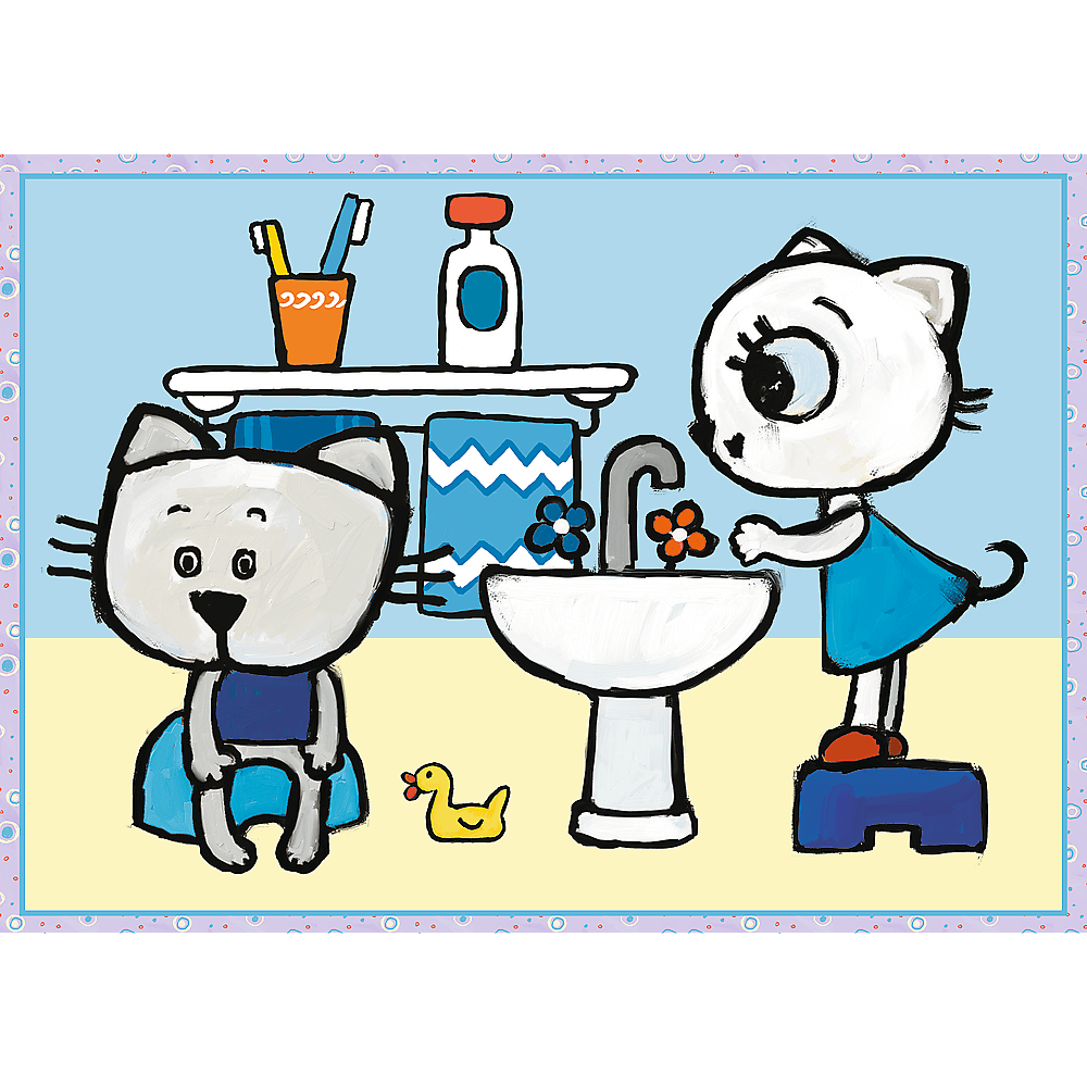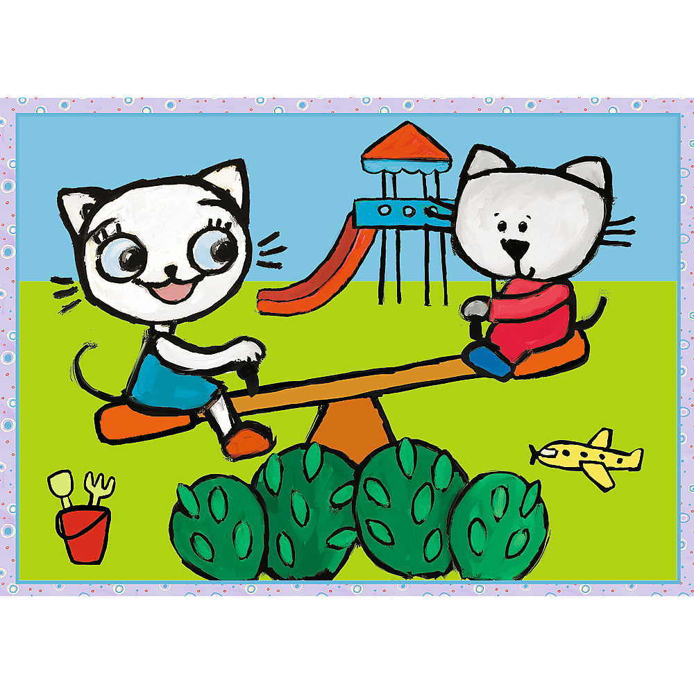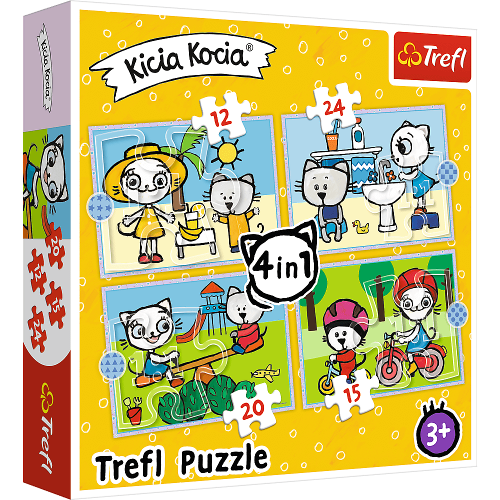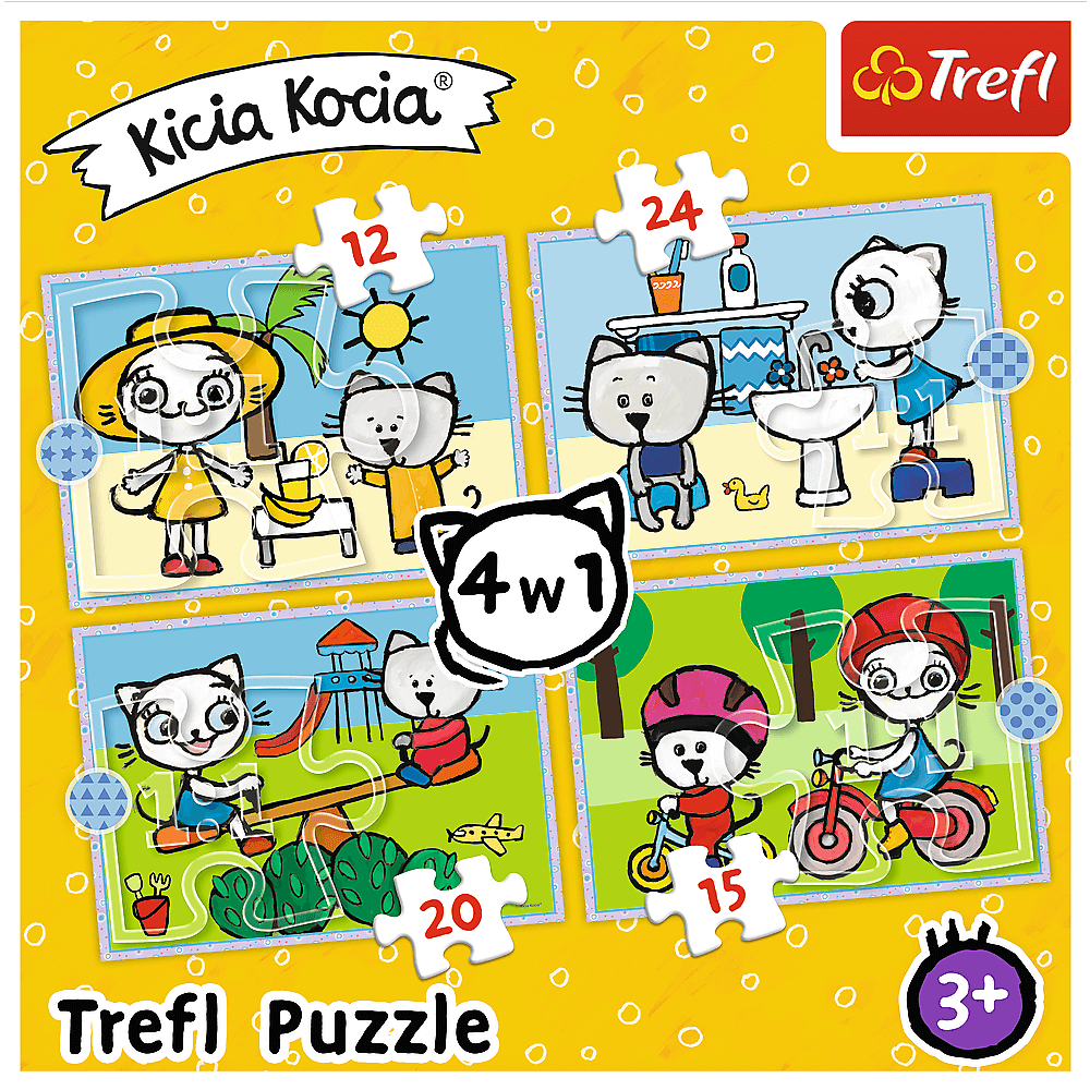 Dzień Kici Koci to puzzle dla dzieci składające się z 4 niezależnych układanek, zaprojektowane z myślą o wszystkich fanach i fankach przygód Kici Koci. Po ułożeniu puzzli powstaną cztery obrazki o wymiarach 285 x 205 mm każdy. Zróżnicowana liczba elementów (70, 54, 48 i 35) pozwala na zabawę zarówno młodszym, jak i nieco starszym fanom puzzli.